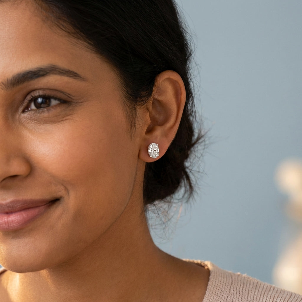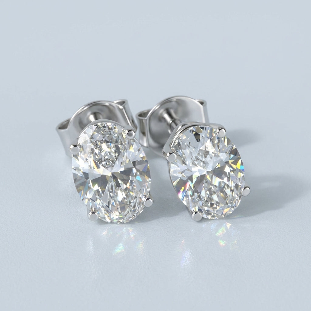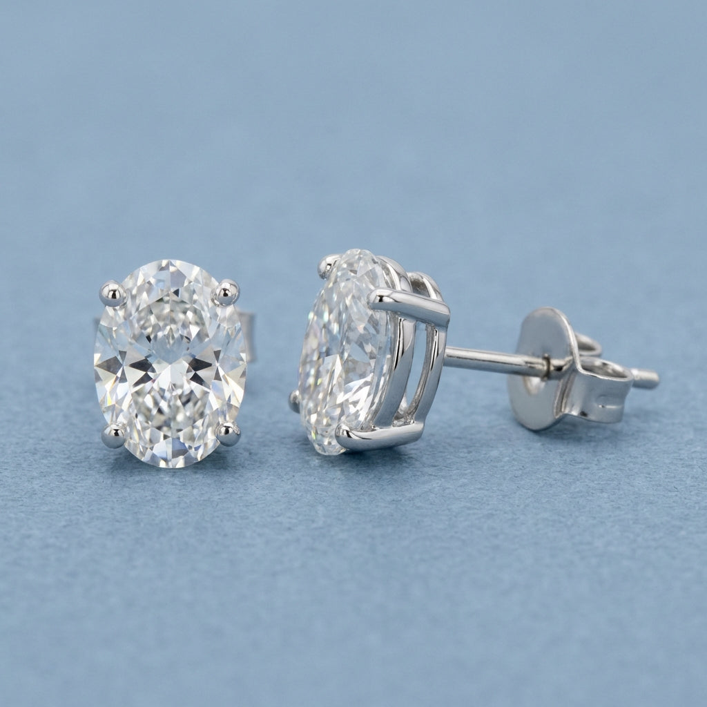 These stunning oval cut lab-grown diamond stud earrings feature a combined total weight of 2.0+ carats, meticulously matched for unparalleled brilliance.