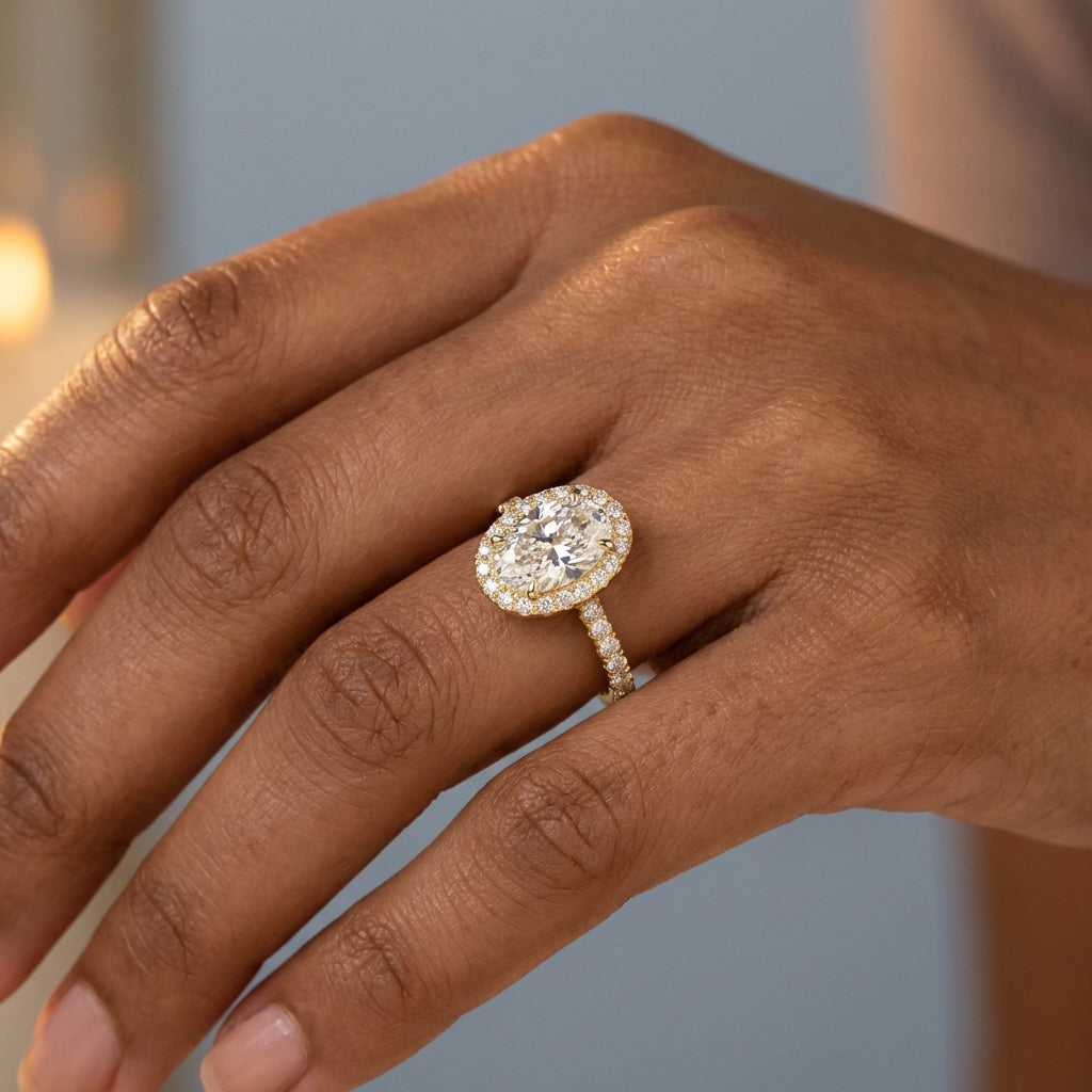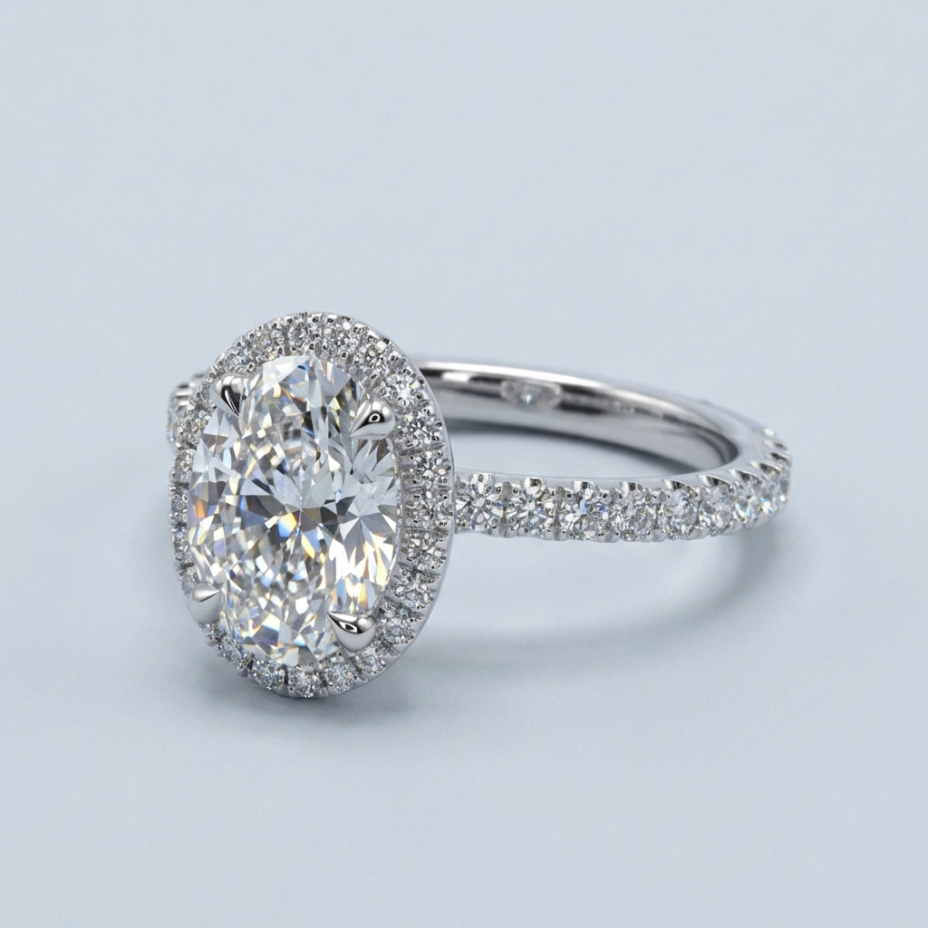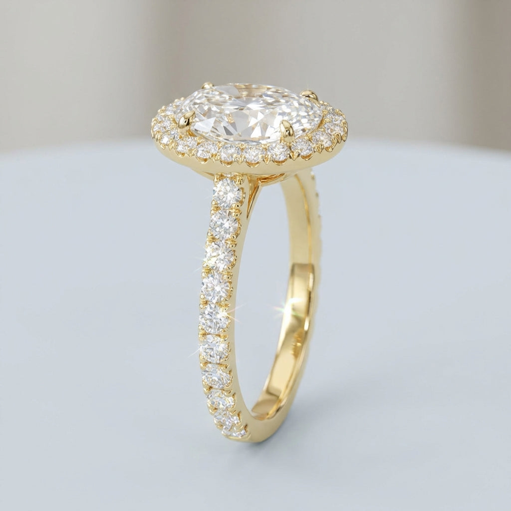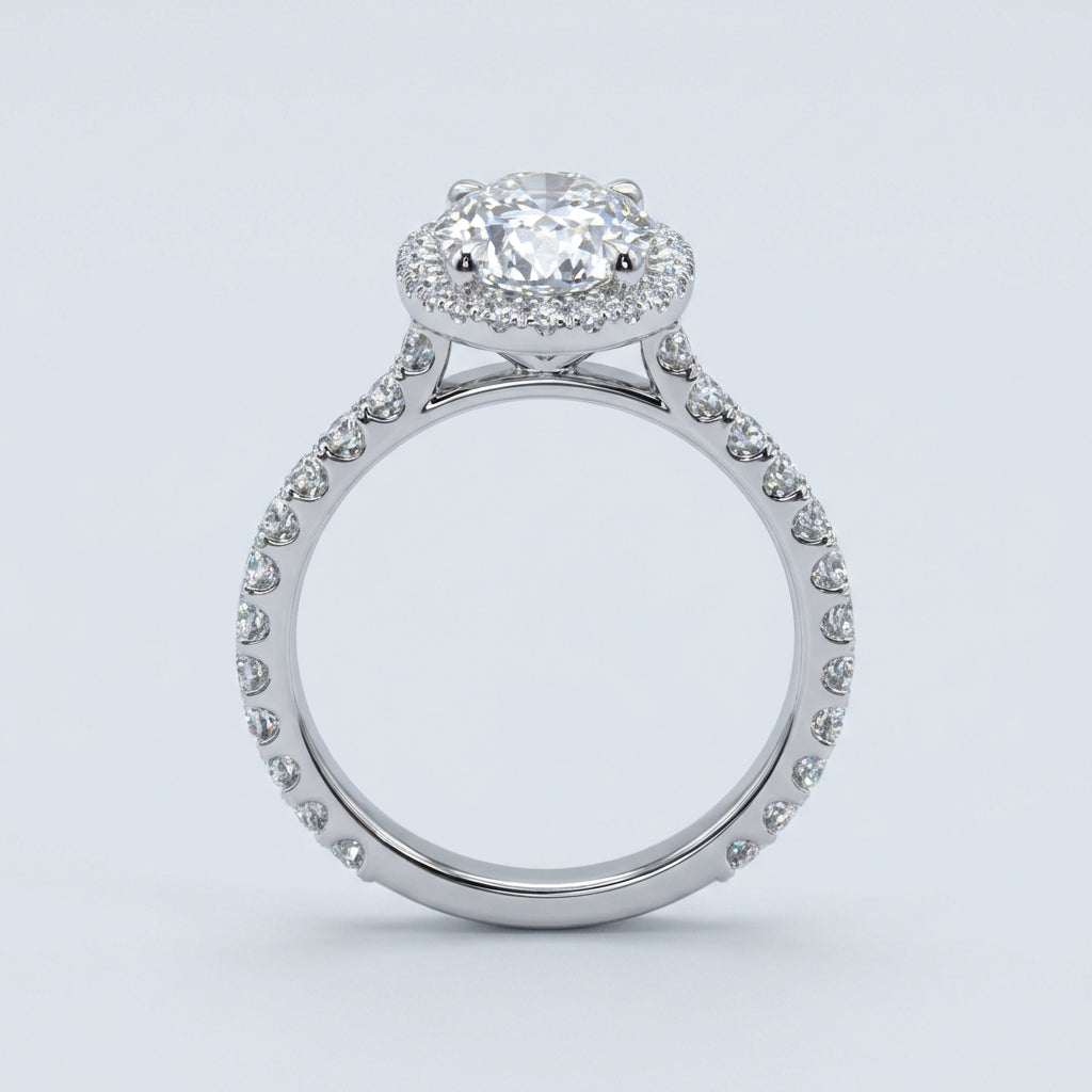 This timeless halo ring features a stunning Oval Brilliant cut center stone, encircled by a meticulously balanced frame of accent diamonds designed to maximize brilliance. Its classic silhouette offers a sophisticated aesthetic that captures light from every angle, making it a perfect choice for an engagement or statement piece.