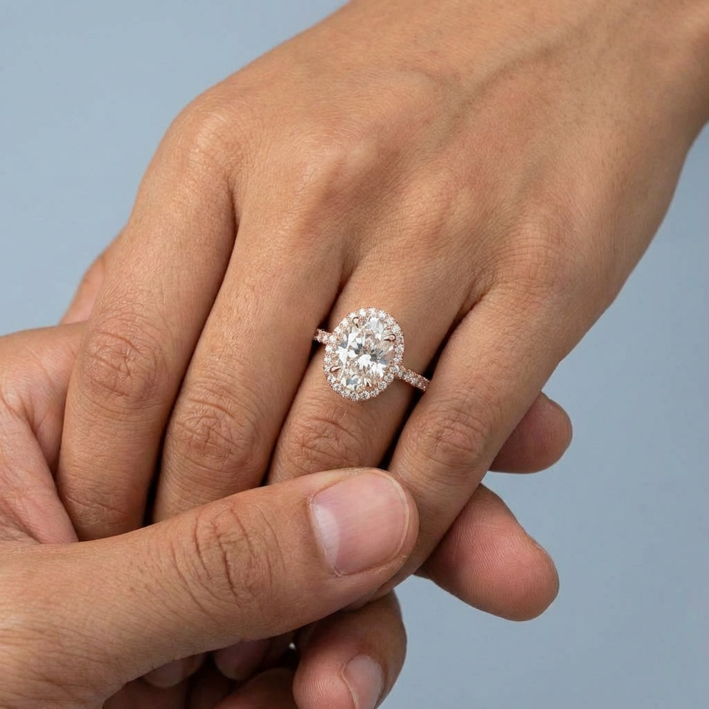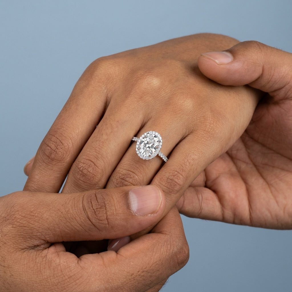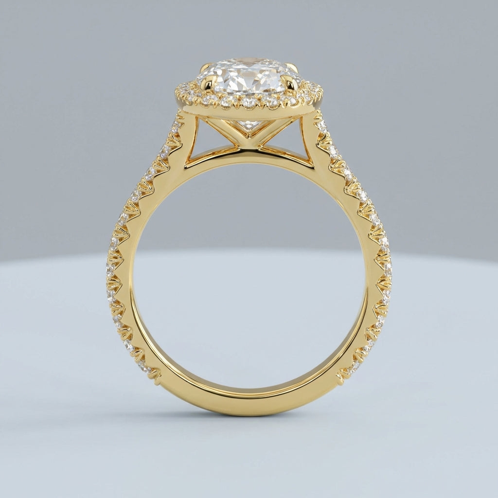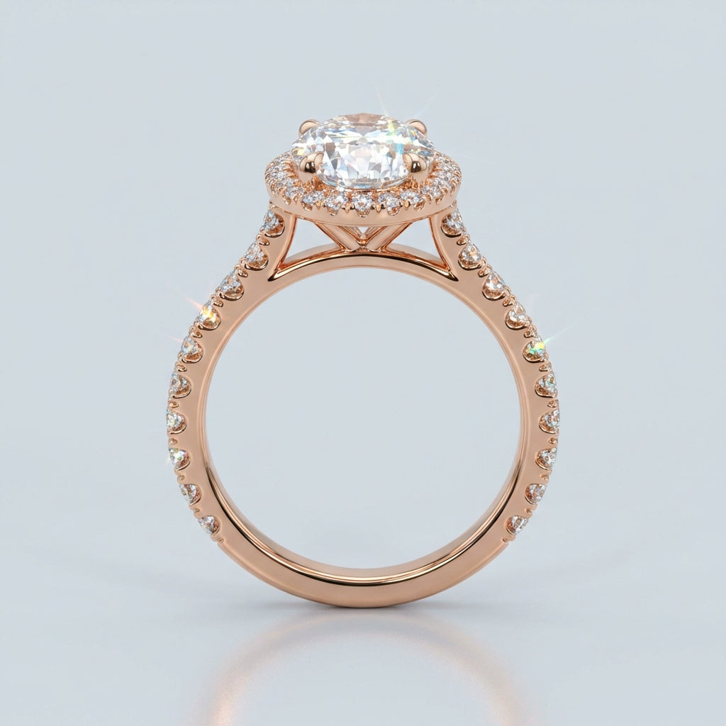 This timeless halo ring features a stunning Oval Brilliant cut center stone, encircled by a meticulously balanced frame of accent diamonds designed to maximize brilliance. Its classic silhouette offers a sophisticated aesthetic that captures light from every angle, making it a perfect choice for an engagement or statement piece.