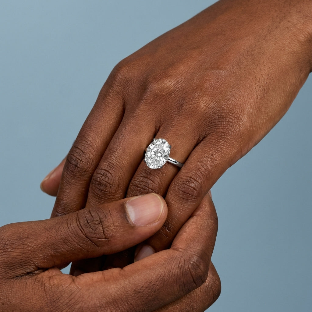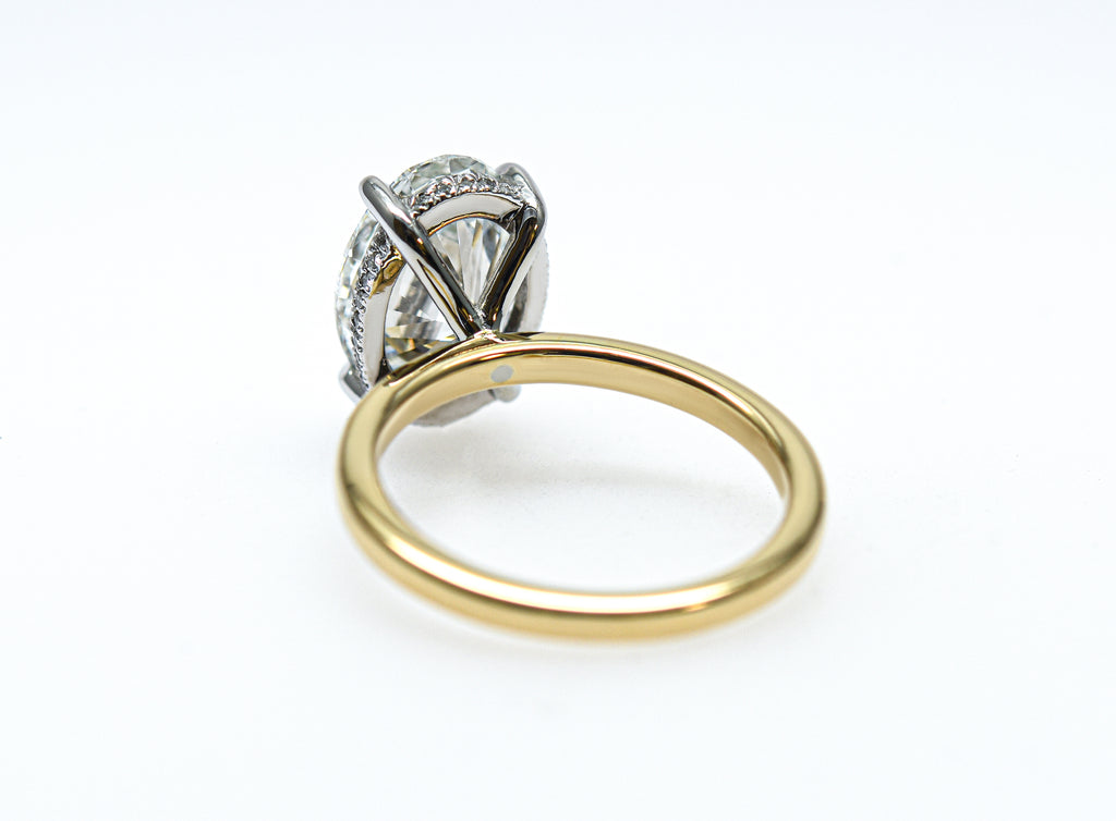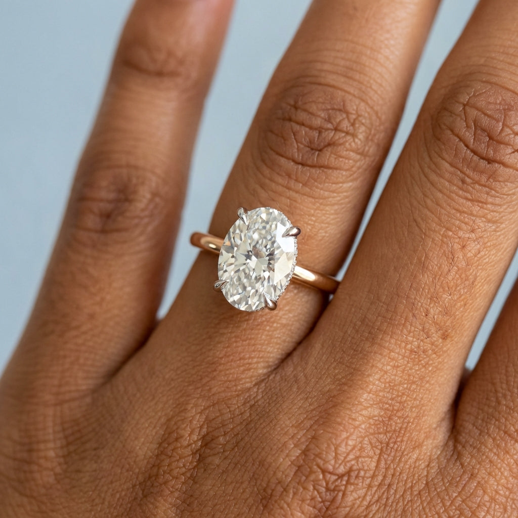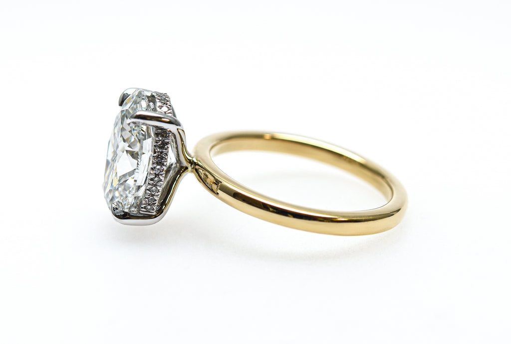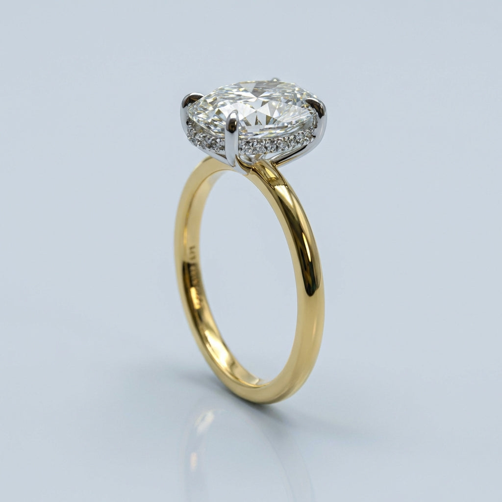 This iconic setting is meticulously handcrafted to maximize the fire and brilliance of your chosen Oval Cut center stone. The diamond is held securely by a sleek four-prong ‘tiger claw’ setting, elevated by a delicate basket featuring a breathtaking hidden halo.