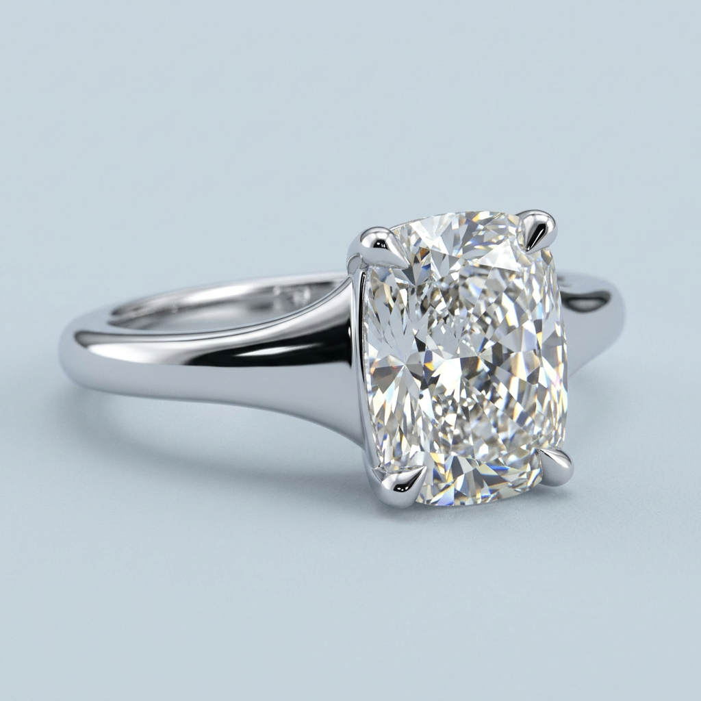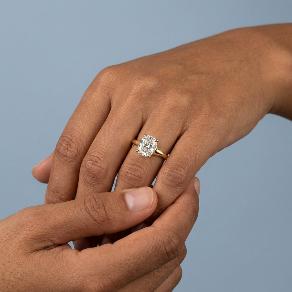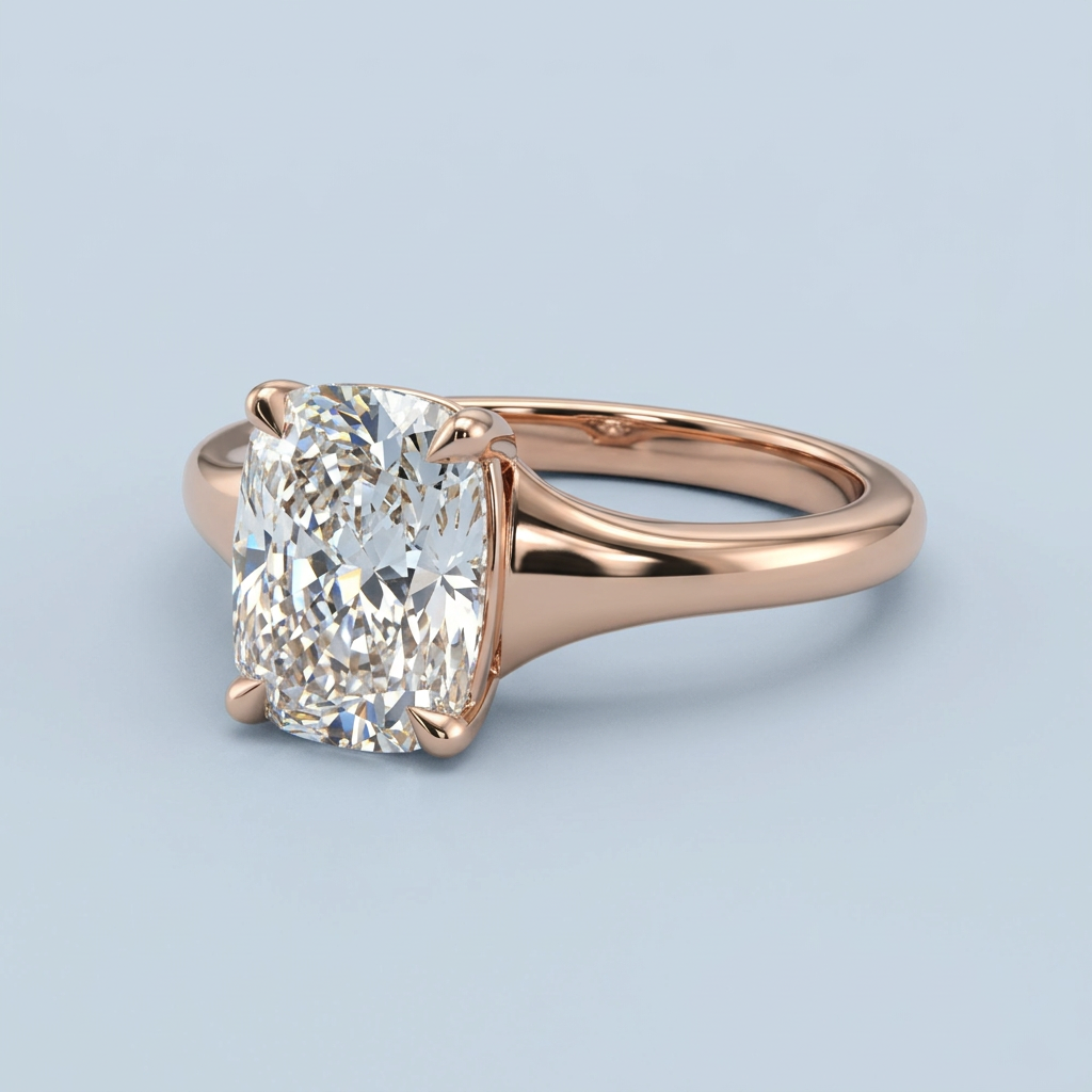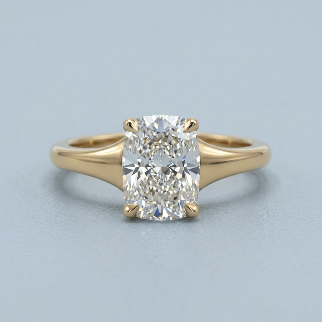 Redefine modern elegance with this exquisite solitaire ring. At its heart lies a stunning elongated cushion-cut diamond, celebrated for its romantic silhouette and captivating brilliance. The center stone is secured by four delicate yet resilient claw prongs, specifically engineered to maximize light exposure and enhance the diamond’s natural fire.