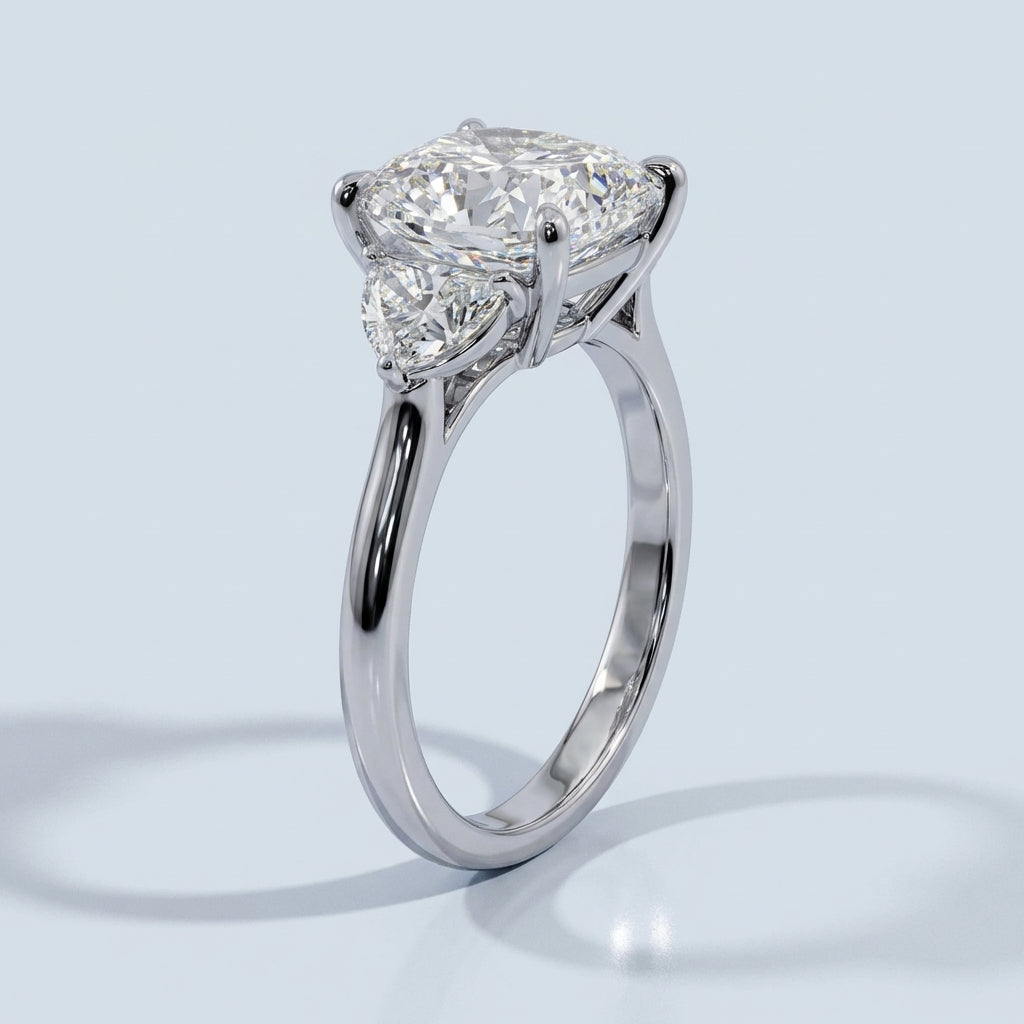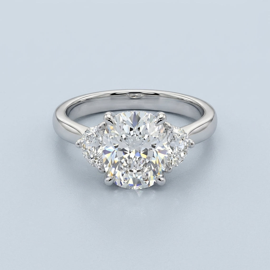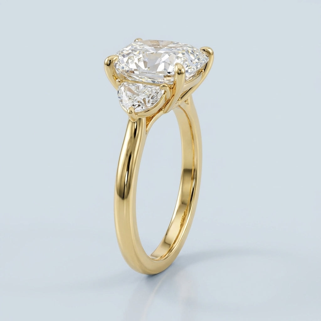 A masterpiece of timeless elegance, this three-stone engagement ring balances classic sophistication with modern craftsmanship. The design centers on a magnificent 6.0-carat elongated cushion-cut diamond, flanked by two precision-cut half-moon side stones that create a seamless flow of brilliance and a stunning silhouette.