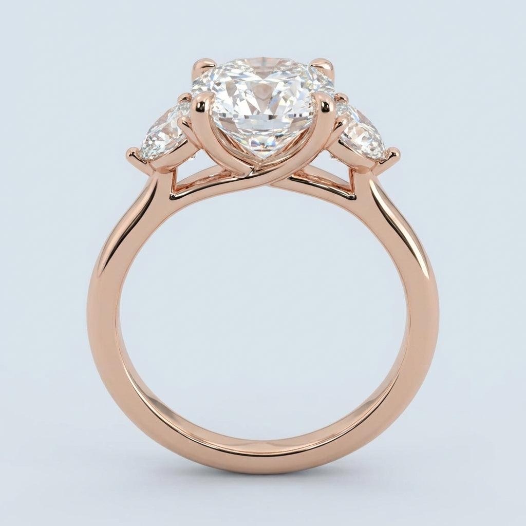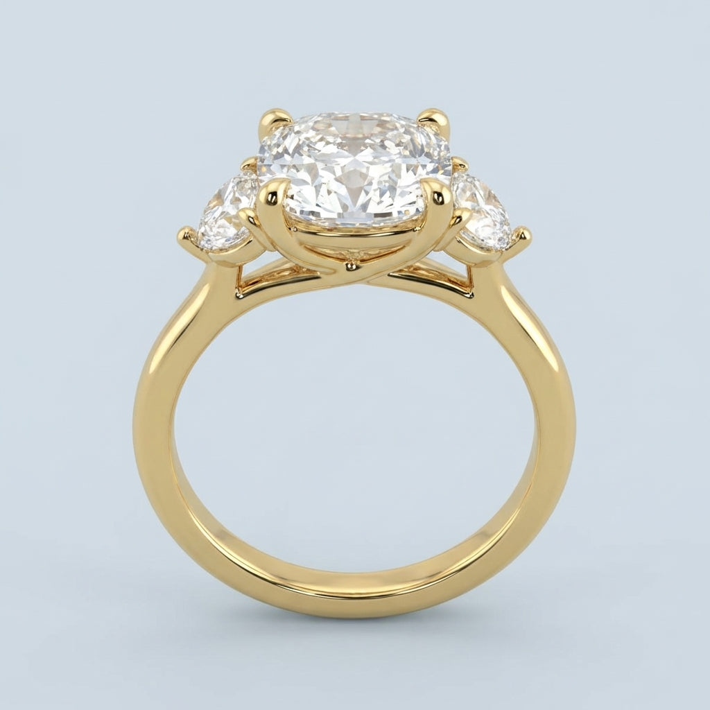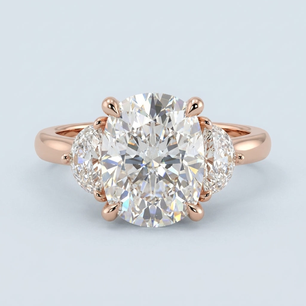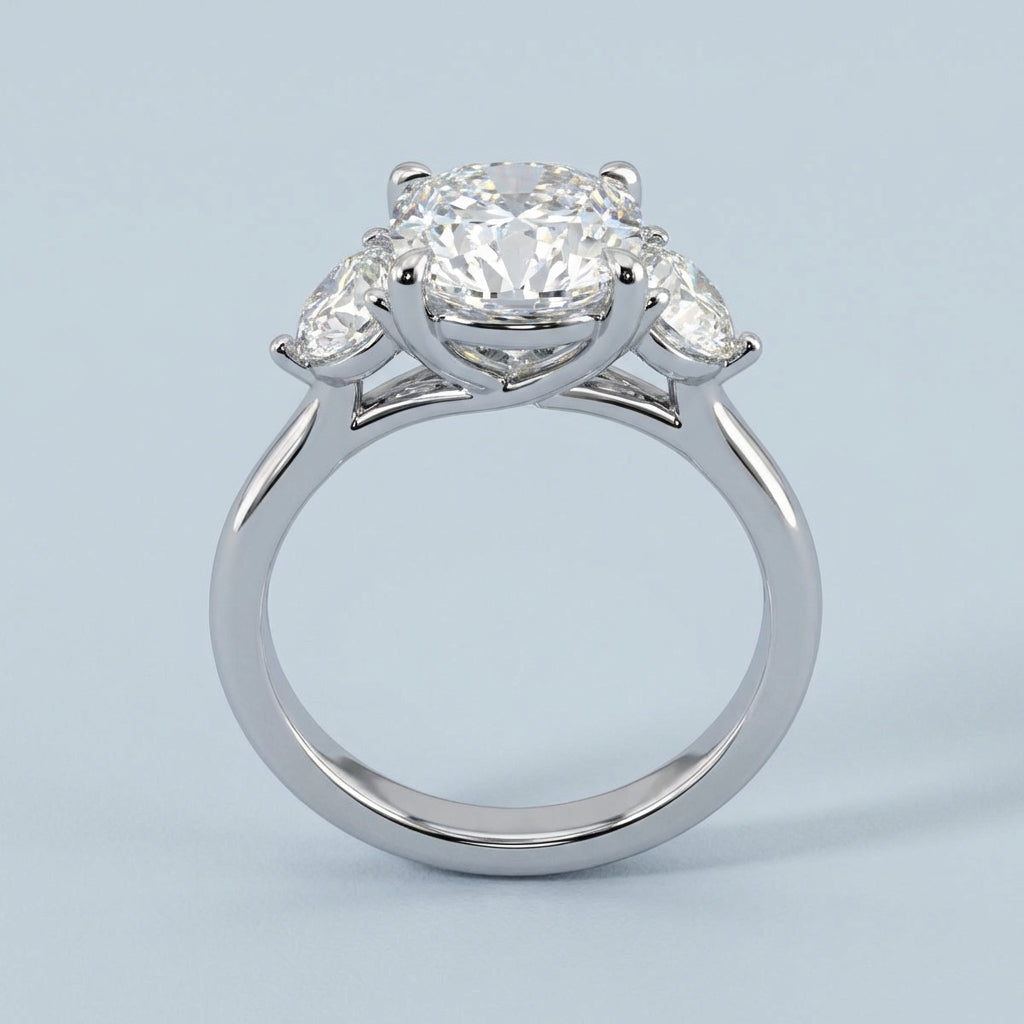 A masterpiece of timeless elegance, this three-stone engagement ring balances classic sophistication with modern craftsmanship. The design centers on a magnificent 6.0-carat elongated cushion-cut diamond, flanked by two precision-cut half-moon side stones that create a seamless flow of brilliance and a stunning silhouette.