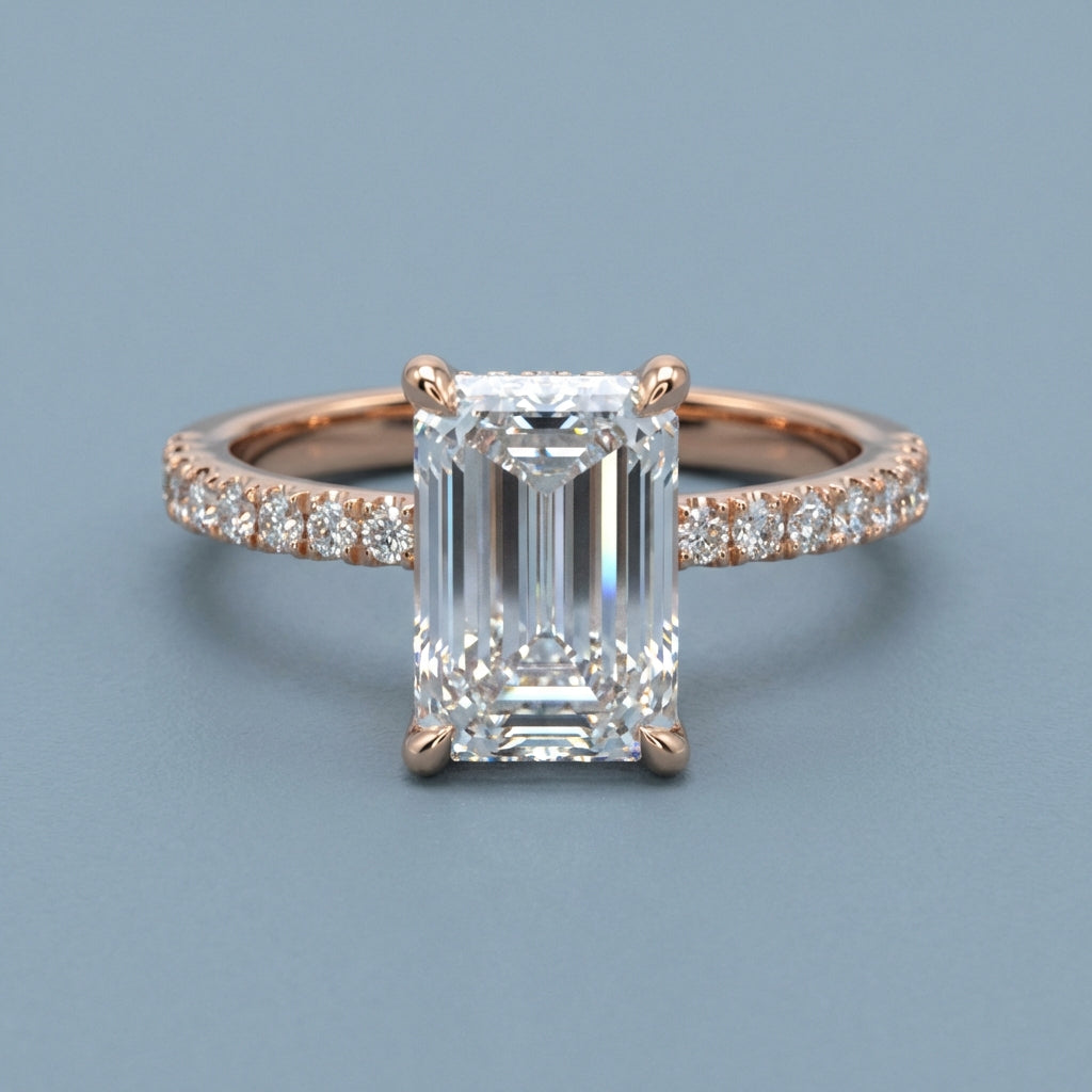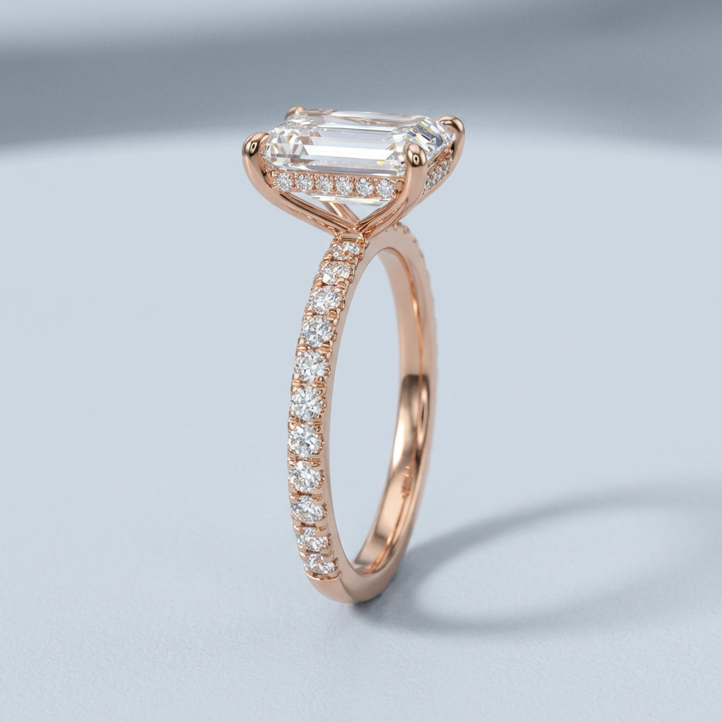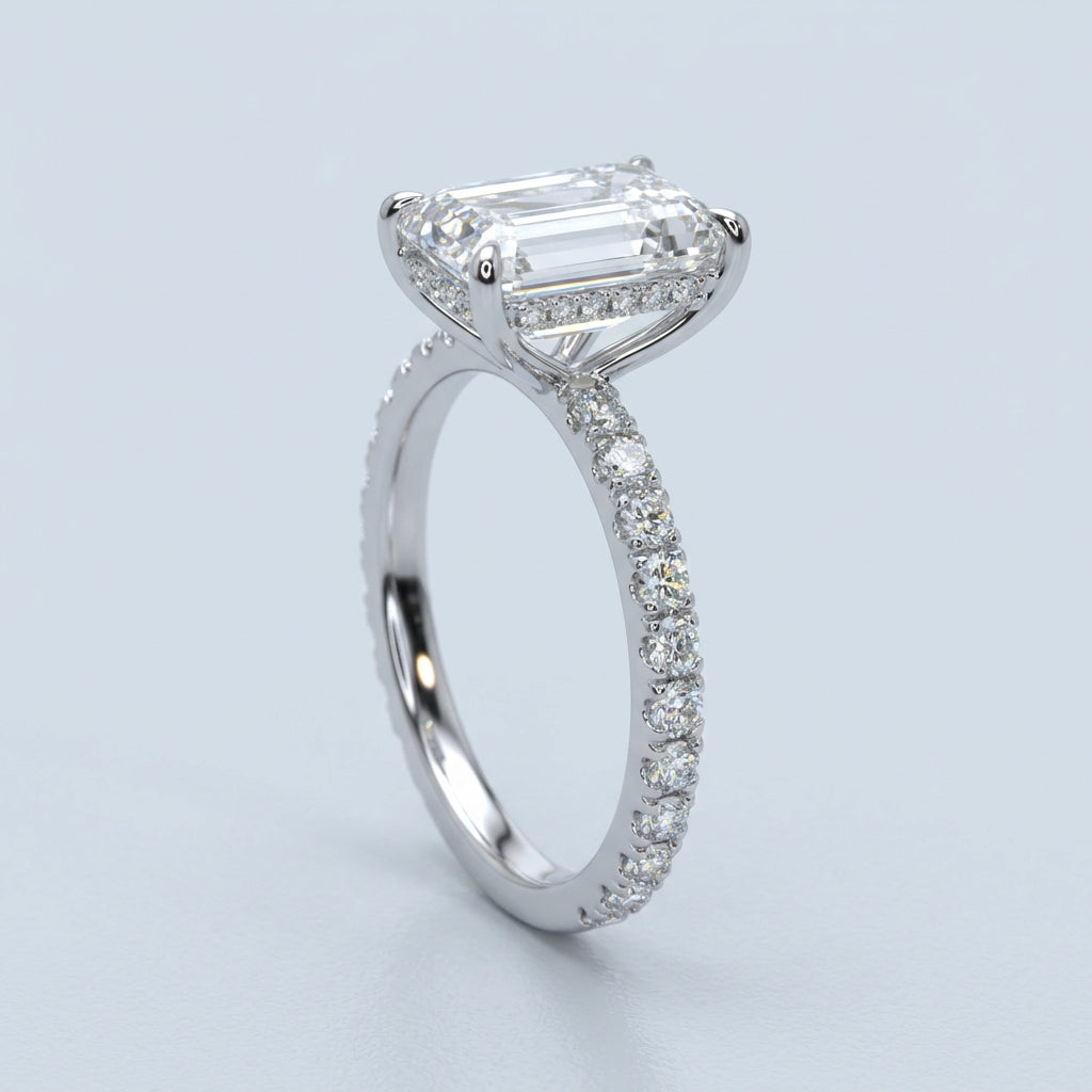 Experience timeless elegance with the Emerald Cut Diamond French Cut Pavé Engagement Ring. This exquisite design showcases a magnificent emerald step-cut lab-grown diamond, secured in a delicate four-prong setting (known for its 'tiger claw' precision), resting atop a petite, refined basket.