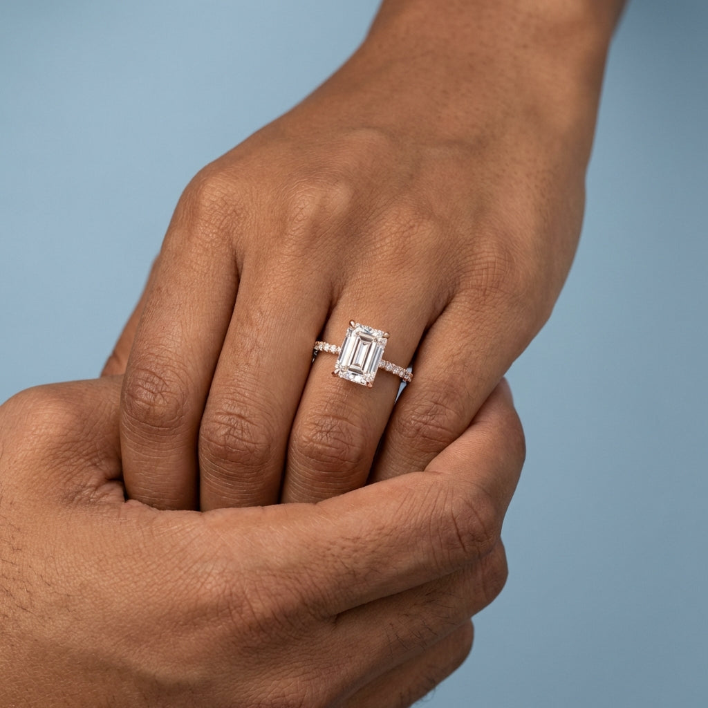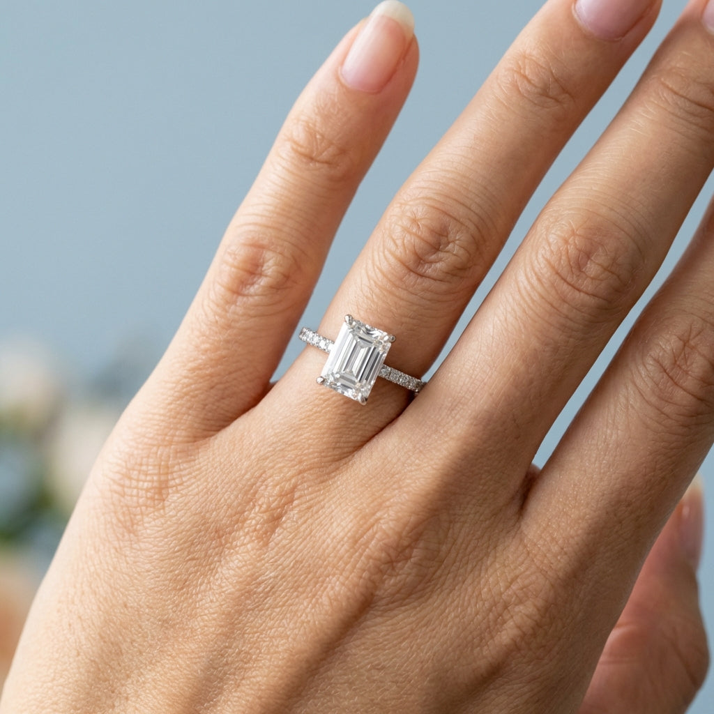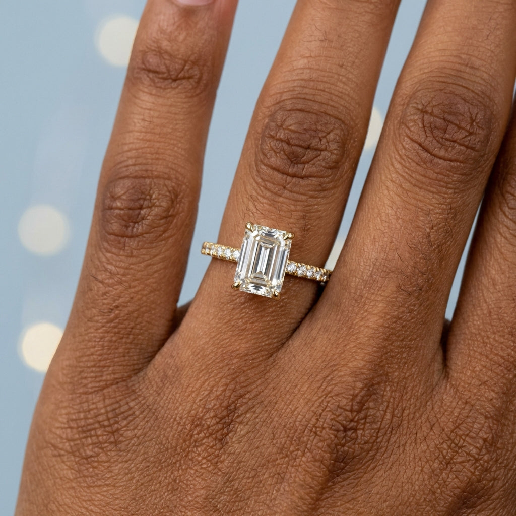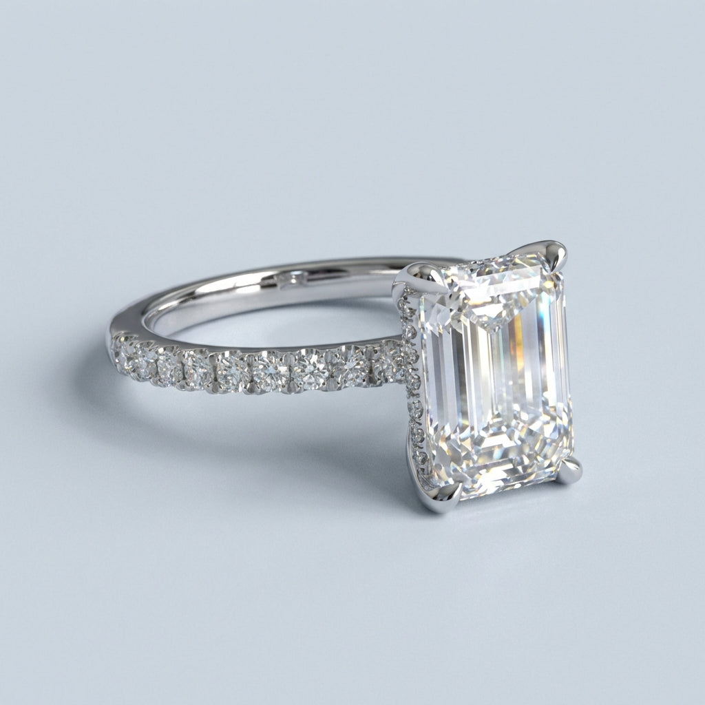 Experience timeless elegance with the Emerald Cut Diamond French Cut Pavé Engagement Ring. This exquisite design showcases a magnificent emerald step-cut lab-grown diamond, secured in a delicate four-prong setting (known for its 'tiger claw' precision), resting atop a petite, refined basket.