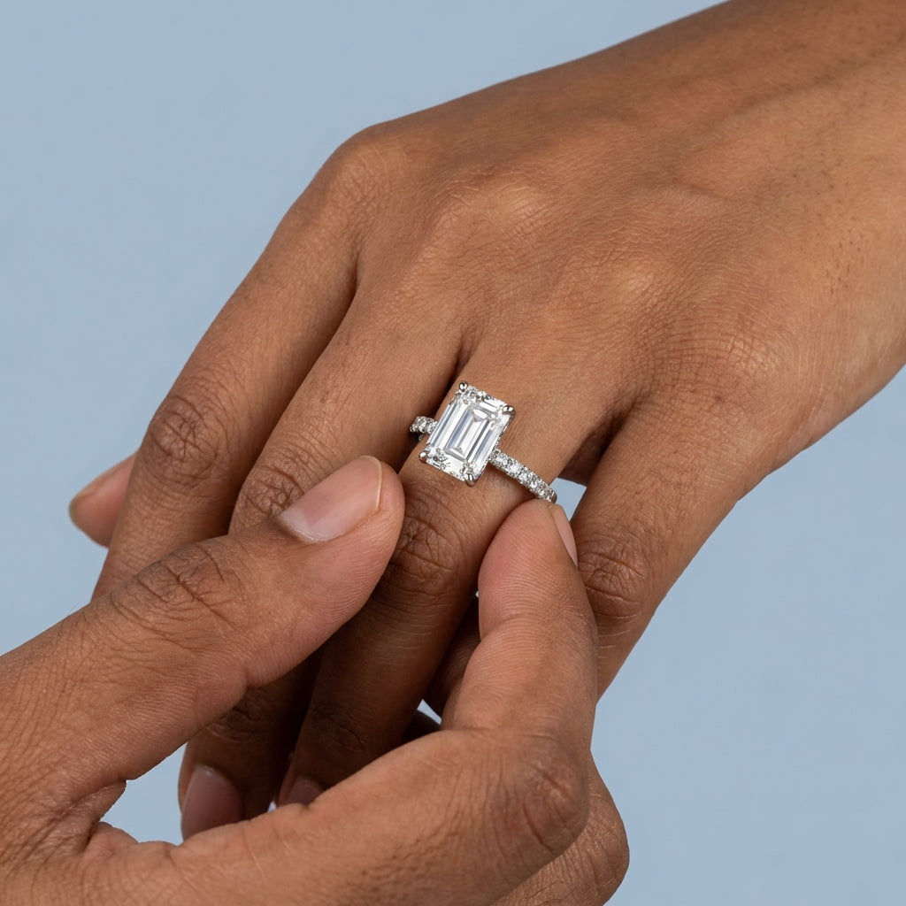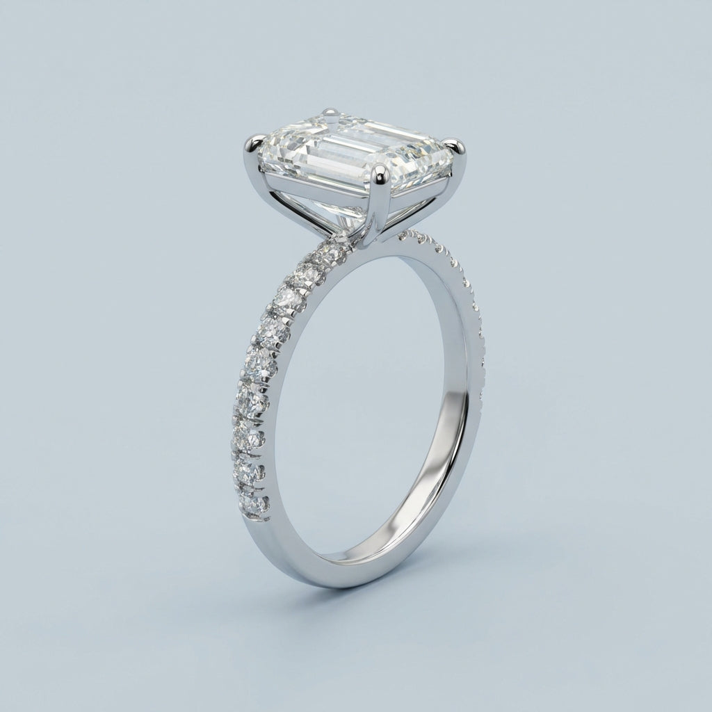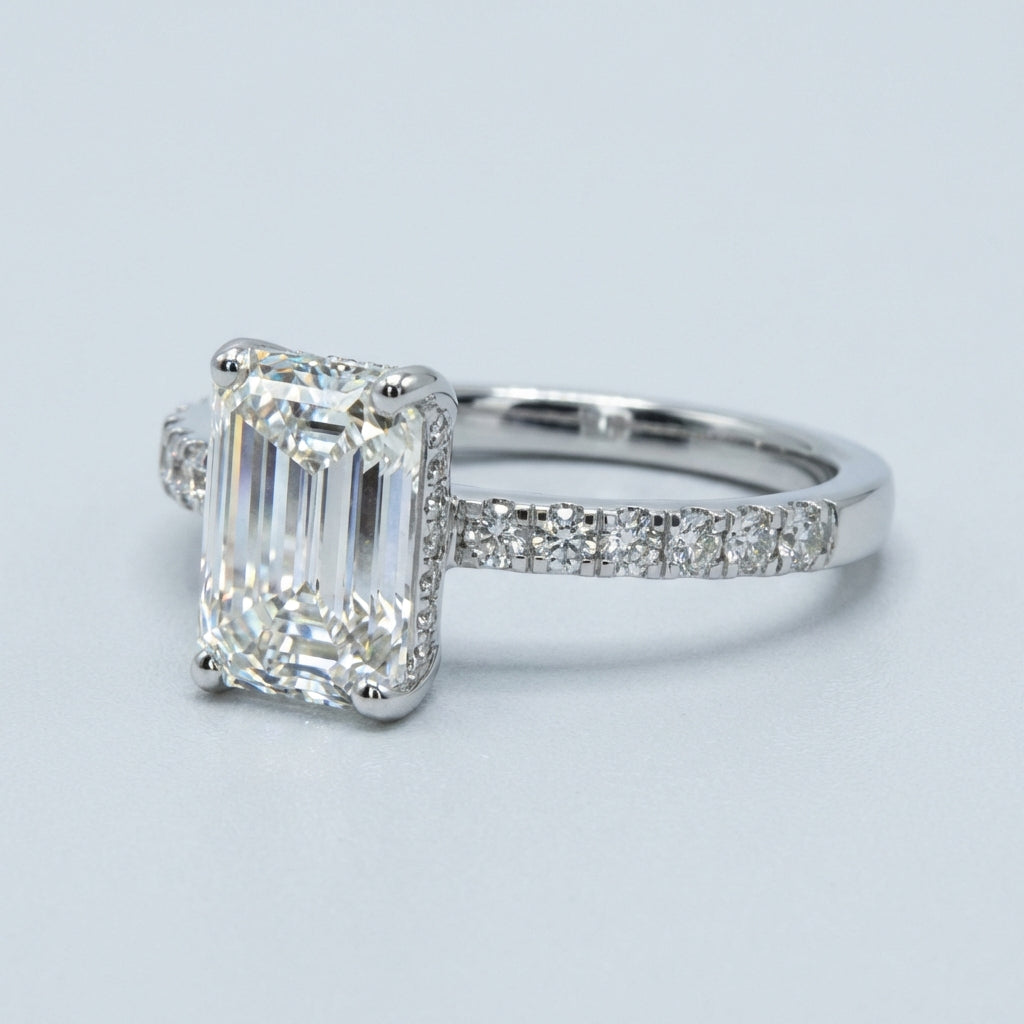 - Center Stone: 3.05 Carat Emerald Step-Cut Lab-Grown Diamond (IGI Certified)
