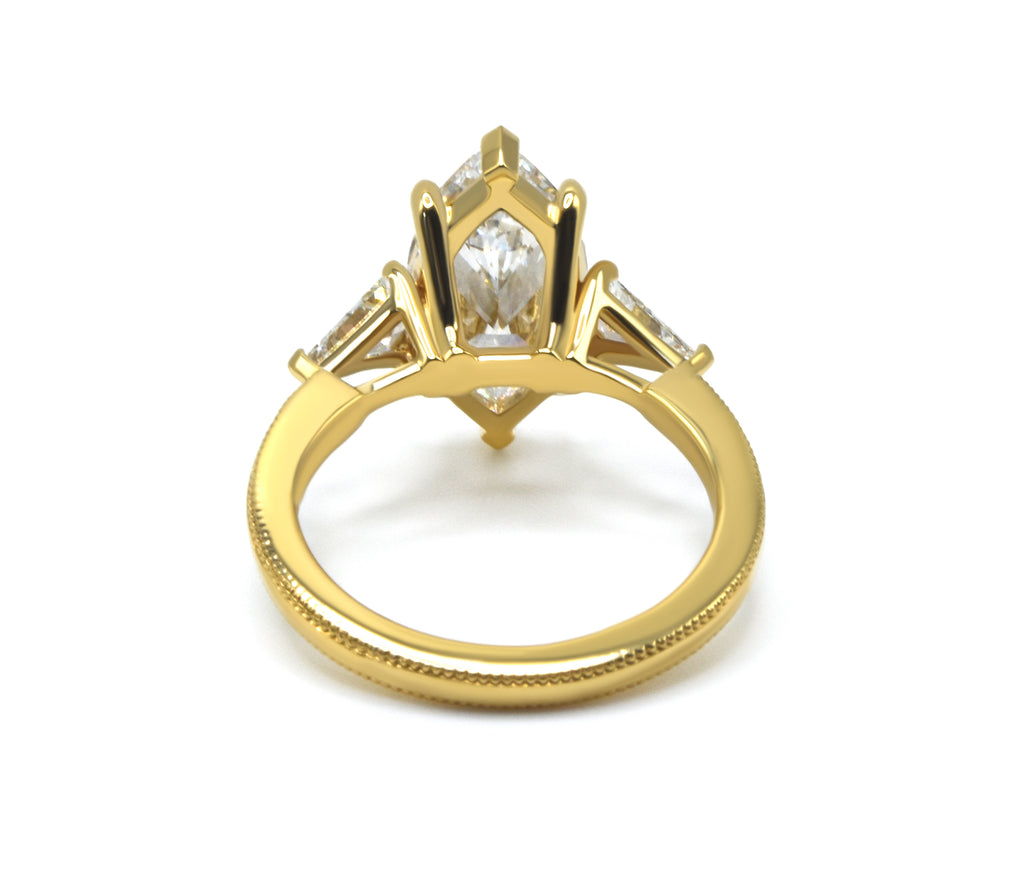 This stunning ring features a captivating marquise cut lab-grown diamond as the centerpiece, gracefully flanked by two shield-modified lab-grown diamonds. This ring is a beautiful and ethical choice for those seeking a unique and sustainable engagement ring.
