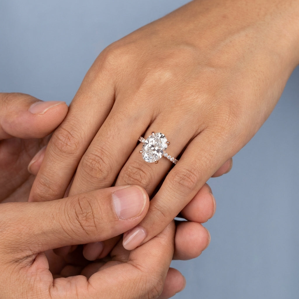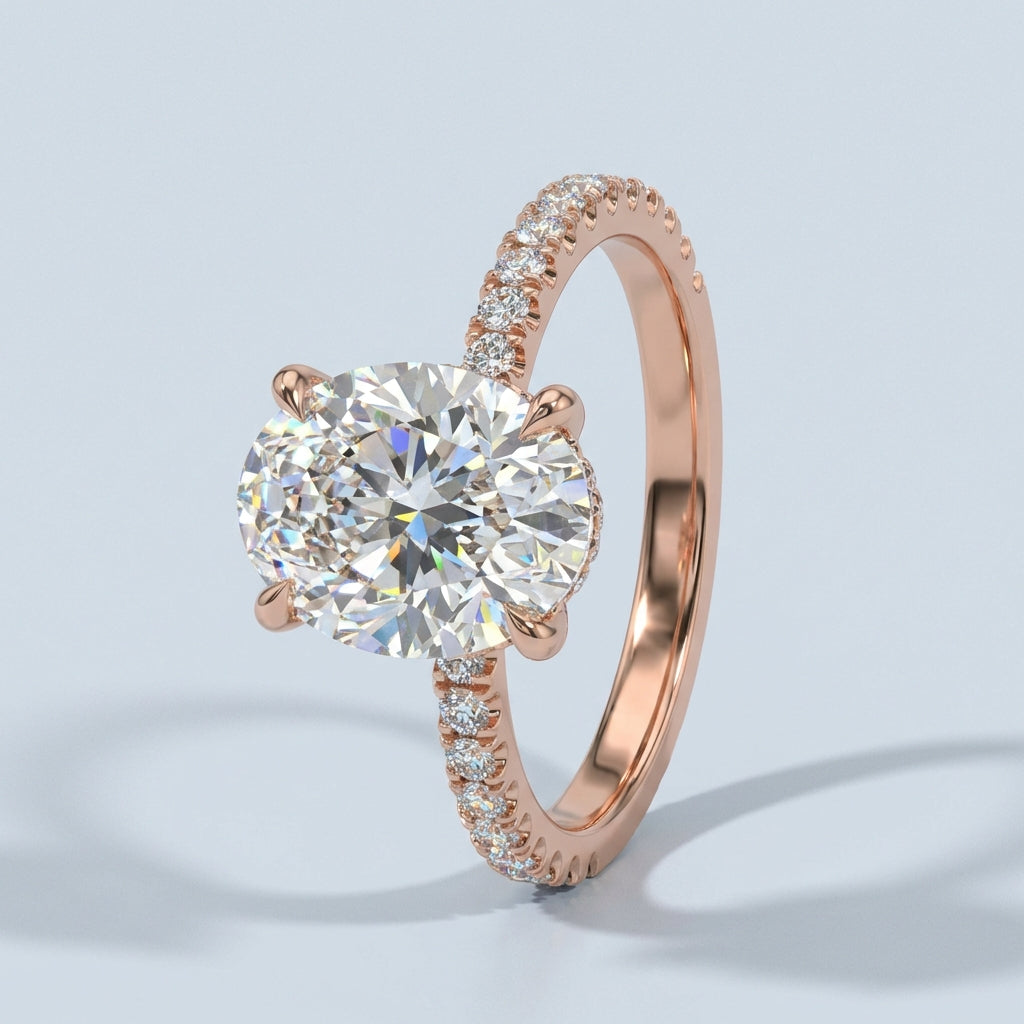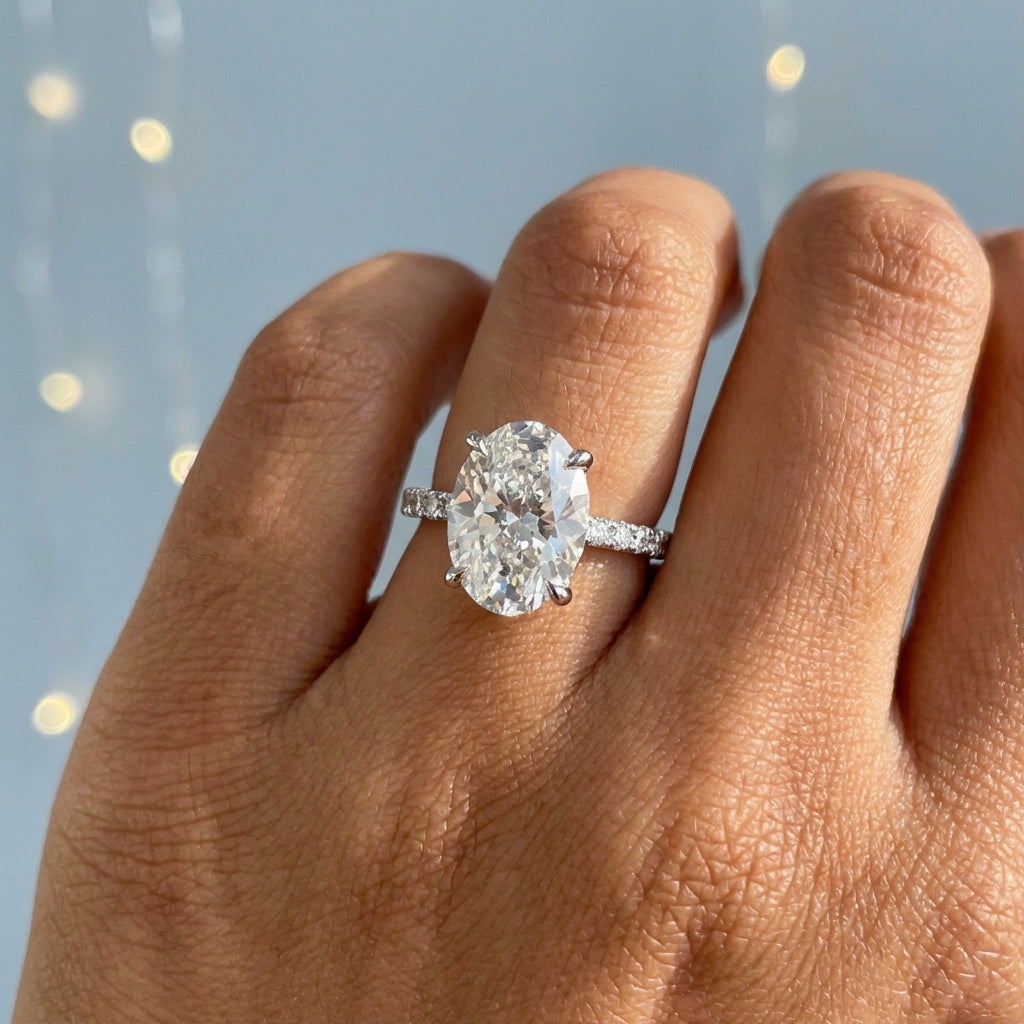This iconic and meticulously handcrafted setting is designed to elegantly showcase an oval brilliant cut center stone. The diamond is secured by delicate four-prong tiger claws and rests within a petite basket, creating the sought-after "hidden halo" effect for enhanced brilliance and sparkle.