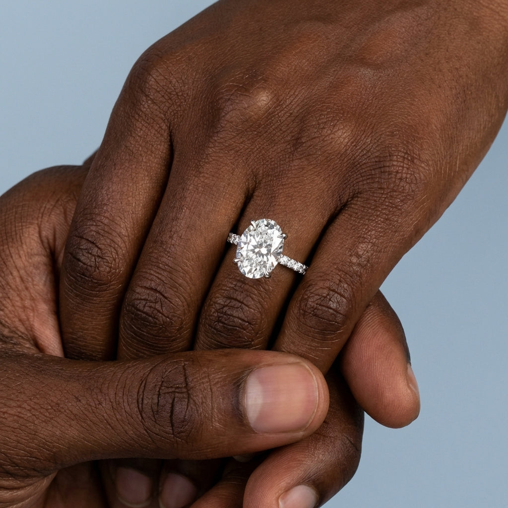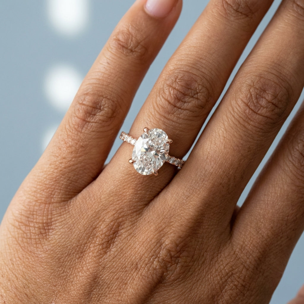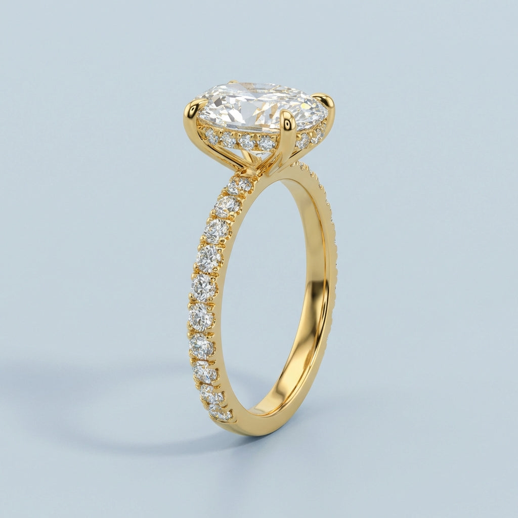 This iconic and meticulously handcrafted setting is designed to elegantly showcase an oval brilliant cut center stone. The diamond is secured by delicate four-prong tiger claws and rests within a petite basket, creating the sought-after "hidden halo" effect for enhanced brilliance and sparkle.
