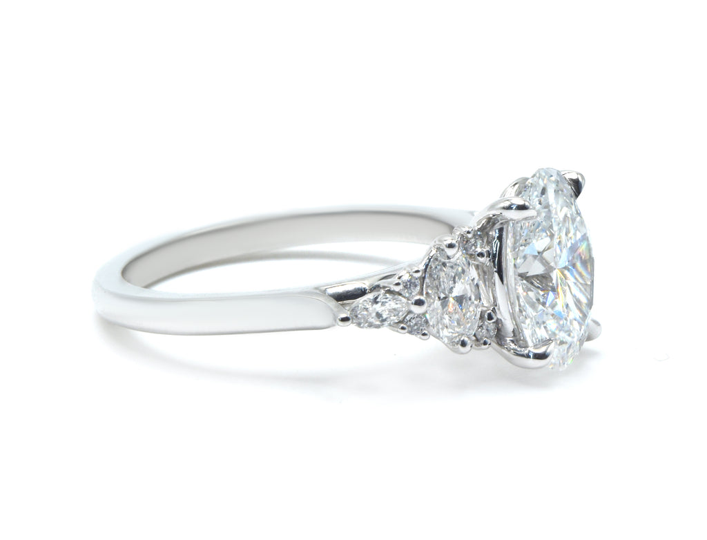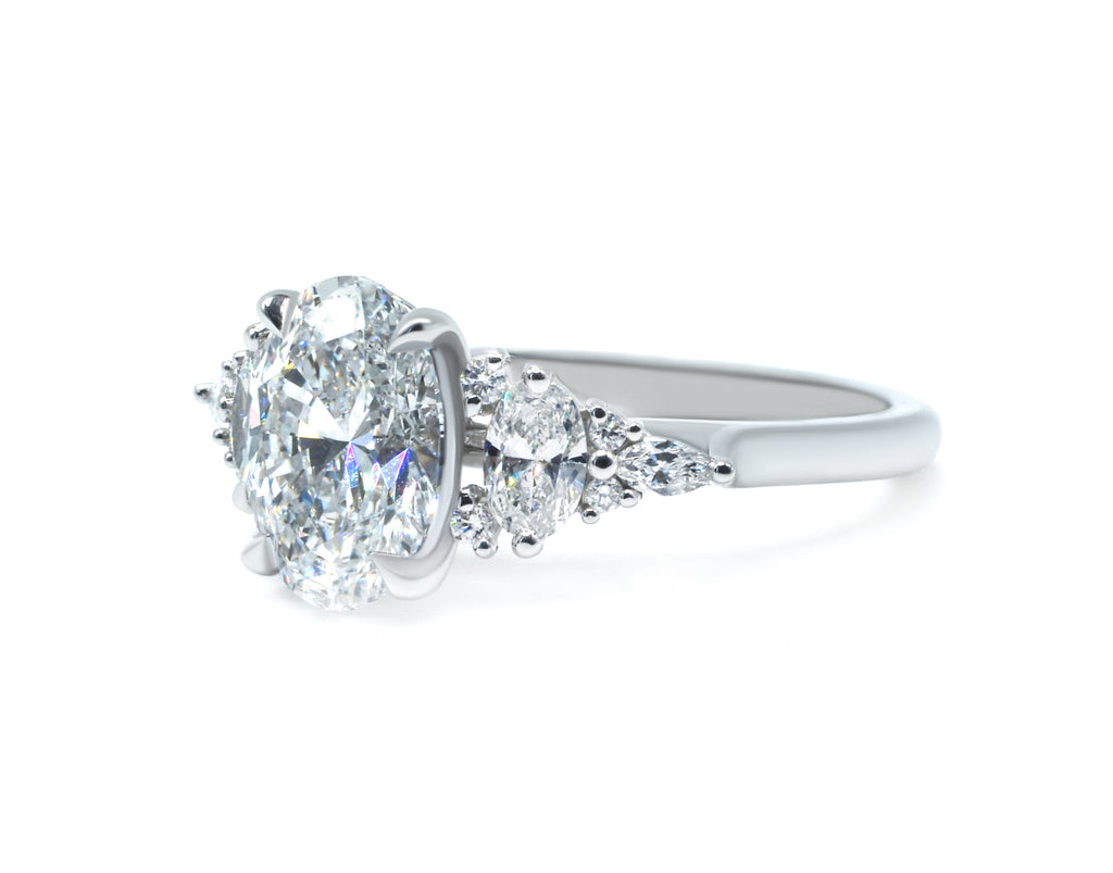 Embrace ethical beauty with our exquisite lab-grown diamond ring, showcasing a magnificent oval-cut diamond flanked by sparkling marquise, pear-shaped and round brilliant cut side accents. Each lab-grown diamond offers exceptional brilliance and fire, providing a responsible yet radiant choice for your special moment. Select your preferred setting from premium white gold, classic yellow gold, delicate rose gold, or durable platinum to complete this breathtaking piece.