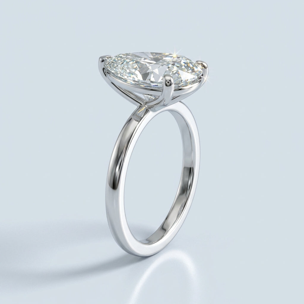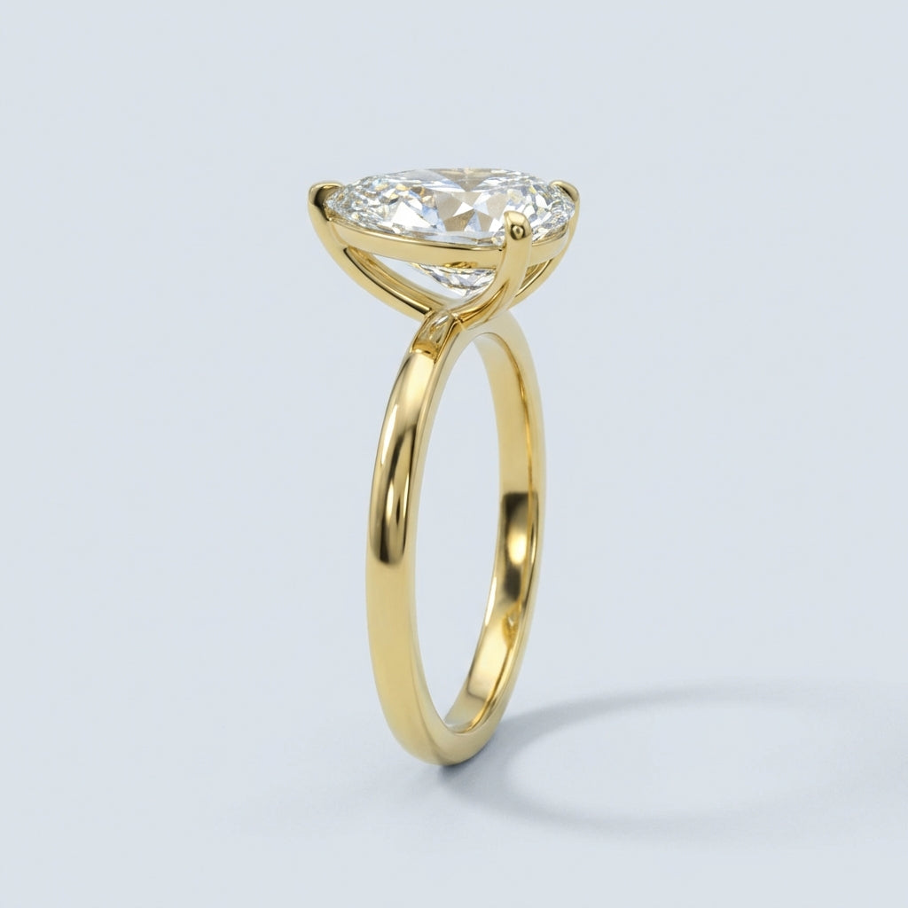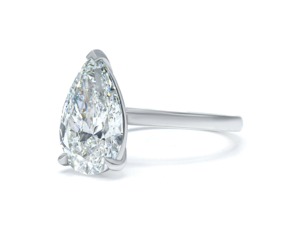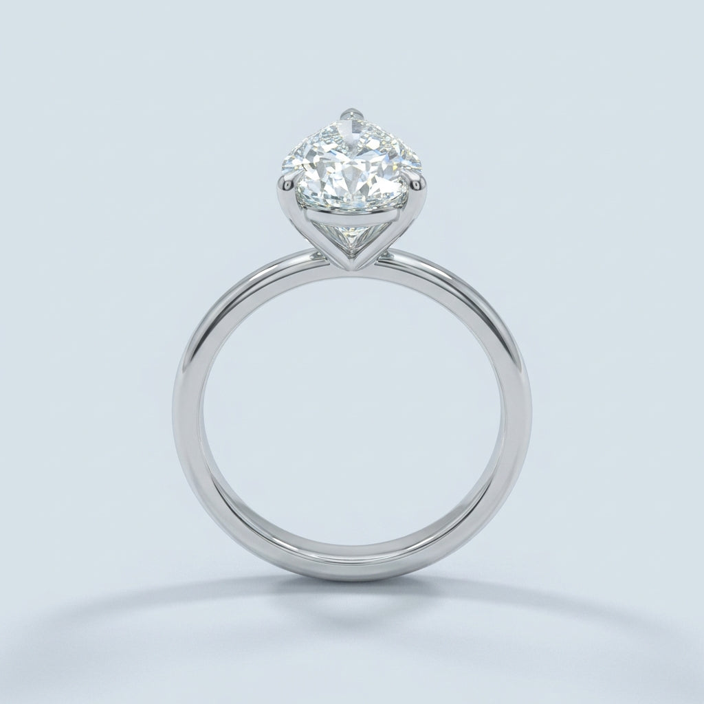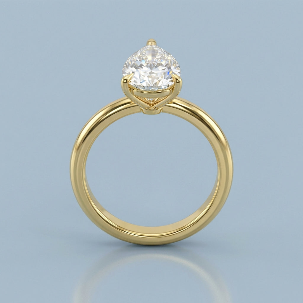 Elegant and architectural, this solitaire engagement ring is designed to highlight the unique beauty of a pear-shaped center stone. While the top view offers a timeless, sleek aesthetic, the side profile reveals a minimalist, open-air basket. This thoughtful design allows for maximum light penetration, ensuring the diamond radiates with unparalleled brilliance from every angle.