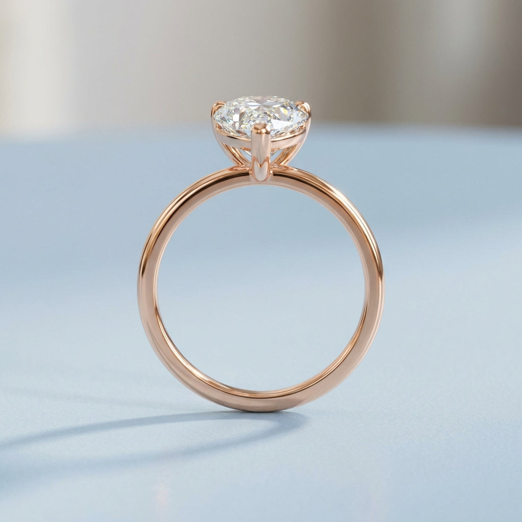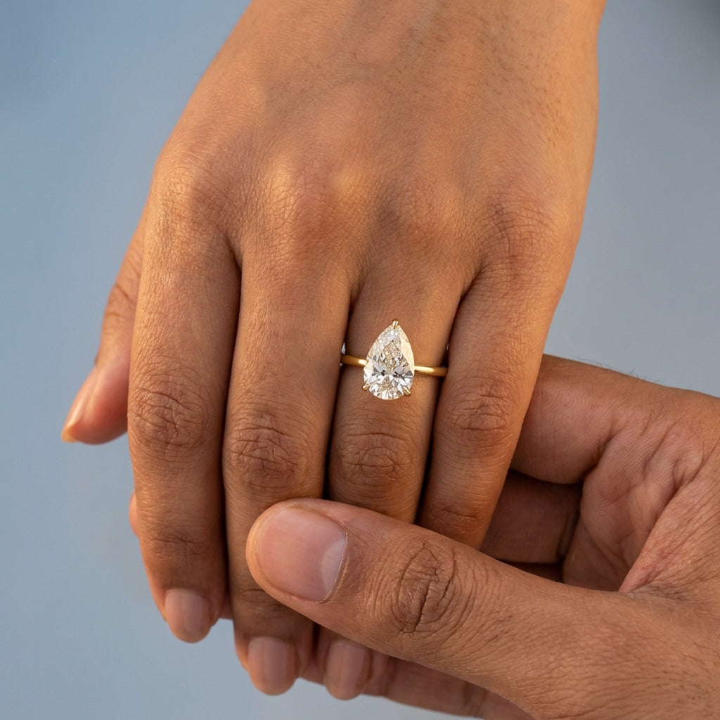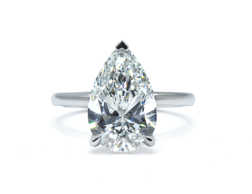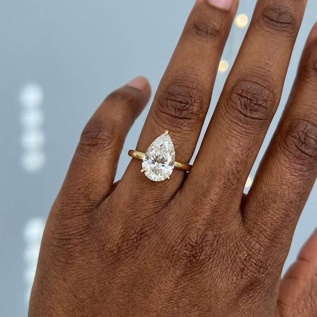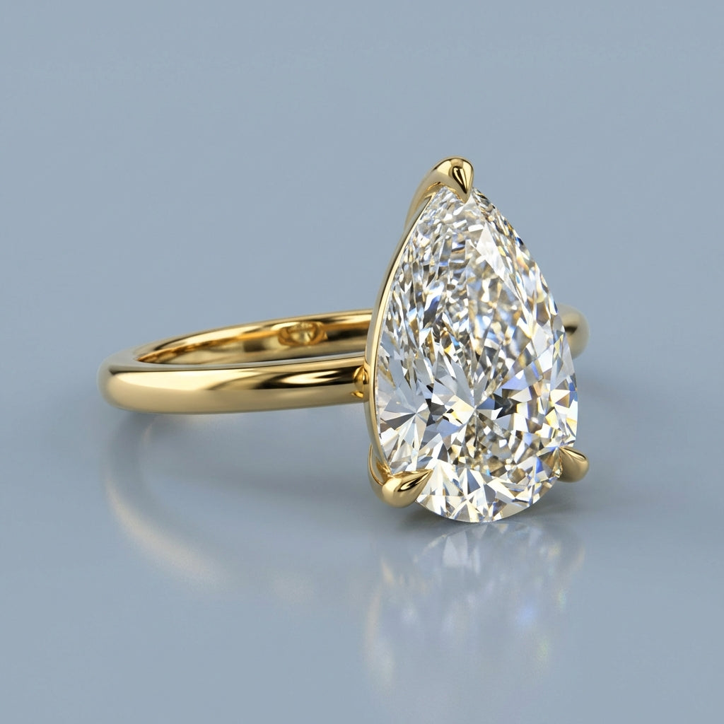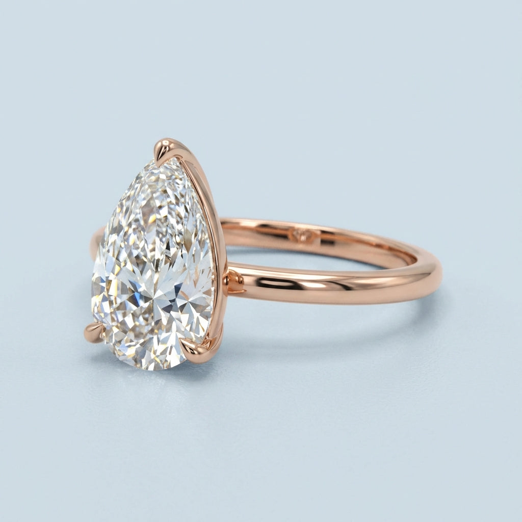 Elegant and architectural, this solitaire engagement ring is designed to highlight the unique beauty of a pear-shaped center stone. While the top view offers a timeless, sleek aesthetic, the side profile reveals a minimalist, open-air basket. This thoughtful design allows for maximum light penetration, ensuring the diamond radiates with unparalleled brilliance from every angle.