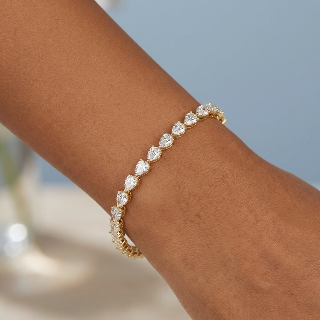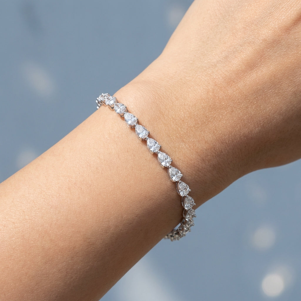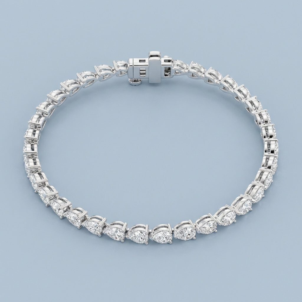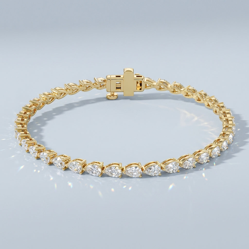 Elevate your jewelry collection with the modern elegance of this pear-shape lab-grown diamond tennis bracelet. This sophisticated piece features a continuous row of shimmering pear-cut diamonds totaling 4.50 carats, each meticulously held in a secure 14K gold prong setting. The unique teardrop silhouette of the diamonds offers a refined twist on the classic tennis design, creating a fluid line of exceptional brilliance around the wrist.