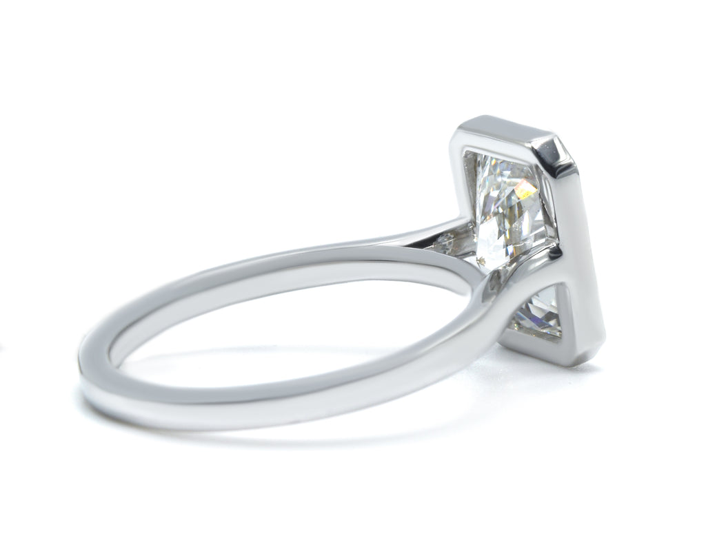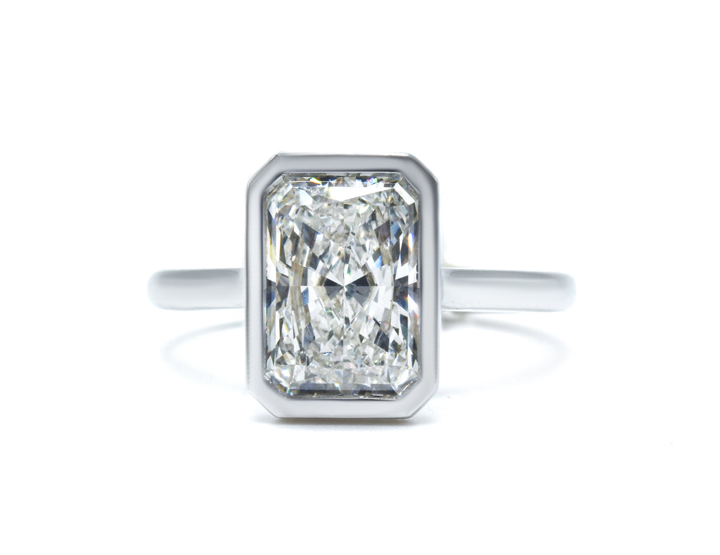 A statement of elegant minimalism, this solitaire ring showcases a captivating radiant cut diamond. Lustrous 14k white gold is sculpted into a full bezel setting that perfectly frames the center stone, enhancing its fire and creating a seamless, polished look. The clean lines and secure design make this ring a timeless choice for the modern bride, blending enduring style with everyday wearability.