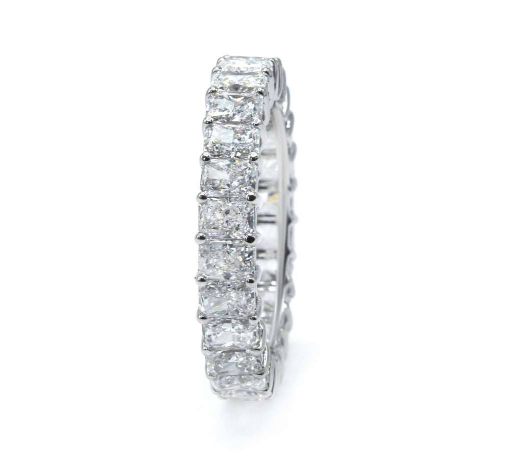 Experience brilliance from every angle. This stunning eternity band features a continuous circle of breathtaking, lab-grown radiant-cut diamonds. Each diamond is secured in a minimal shared-prong setting that reduces metal and maximizes light, creating an uninterrupted band of fire and sparkle. This is sustainable luxury, perfected.