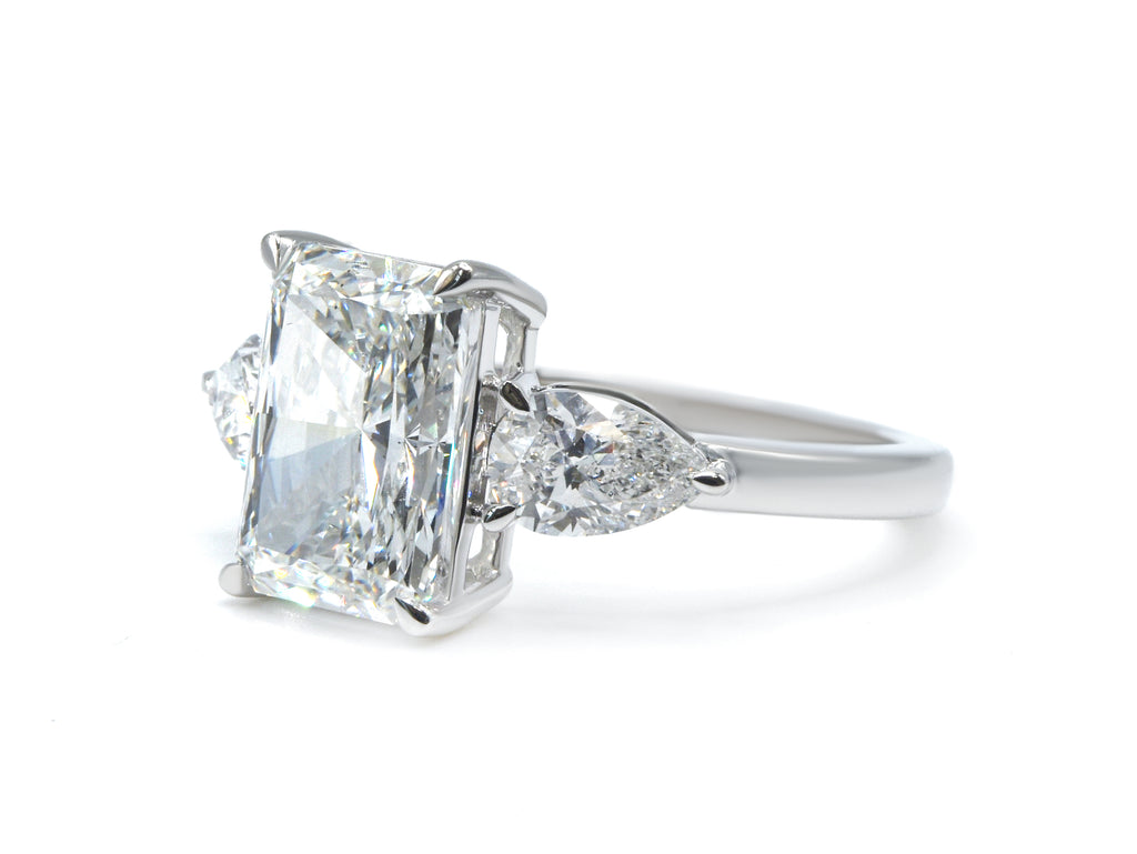Experience modern elegance at its finest with this exceptional three-stone engagement ring. This design masterfully combines the geometric brilliance of a radiant-cut with the classic grace of pear shapes.