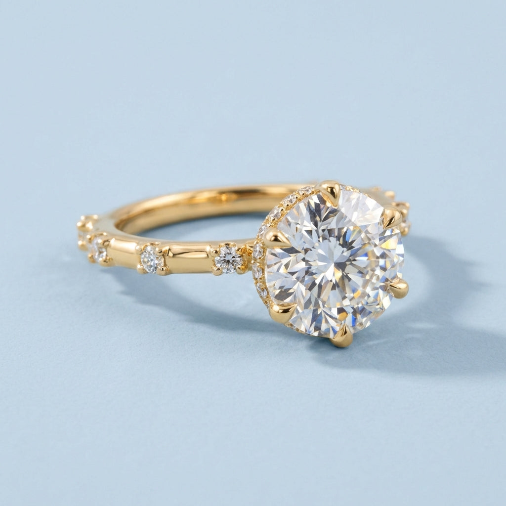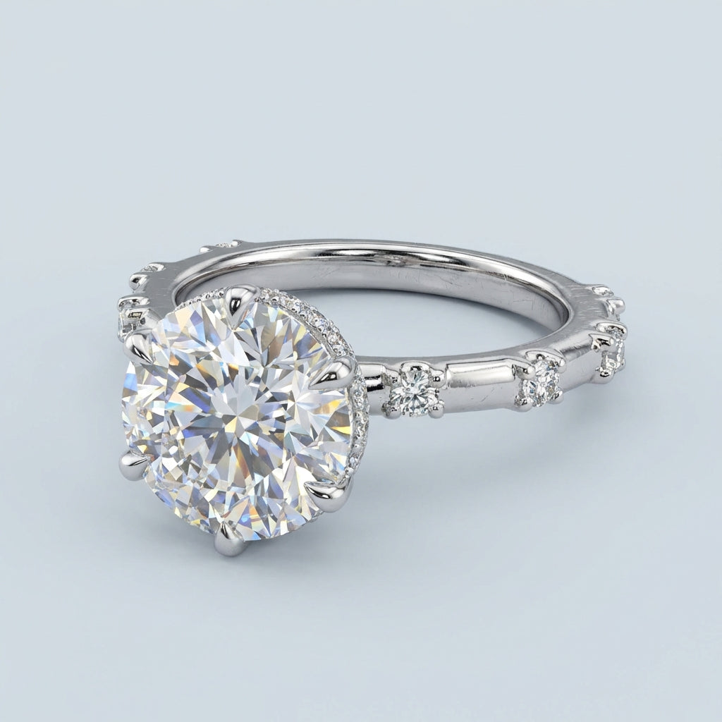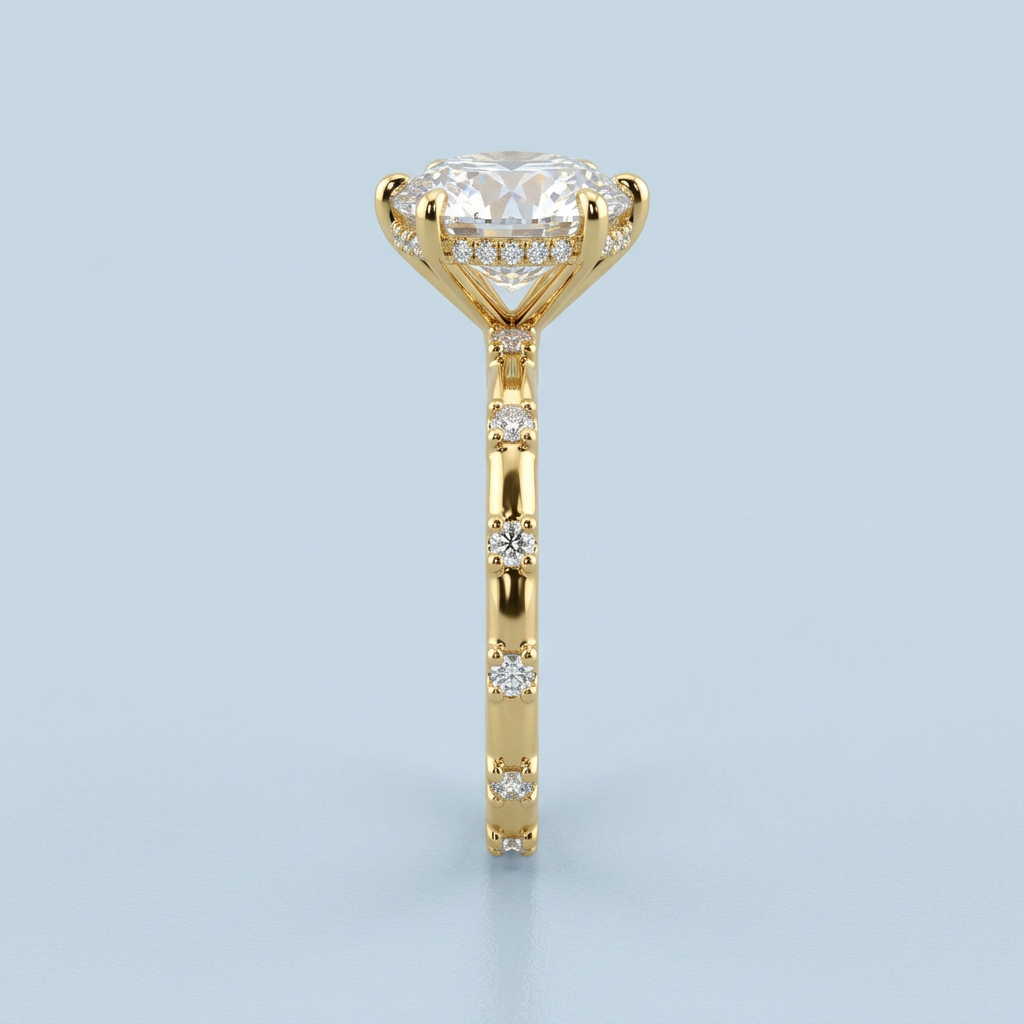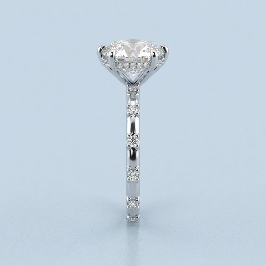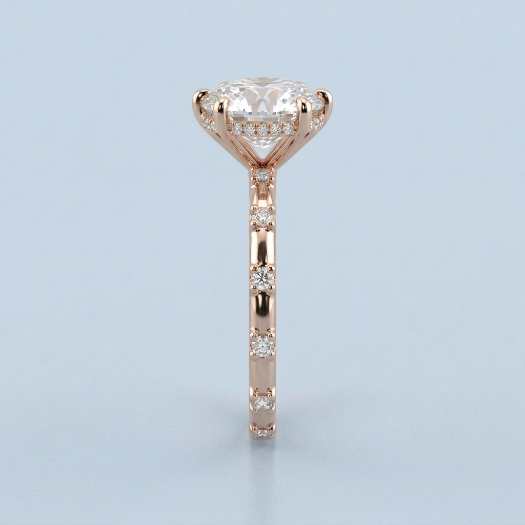 The design features a petite basket and a distinctive split-shank style. This original structural detail allows the surrounding round brilliant accent diamonds—which are expertly pave-set halfway down the band—to stand out, maximizing light return and creating a clean, sophisticated aesthetic that beautifully complements the center stone.