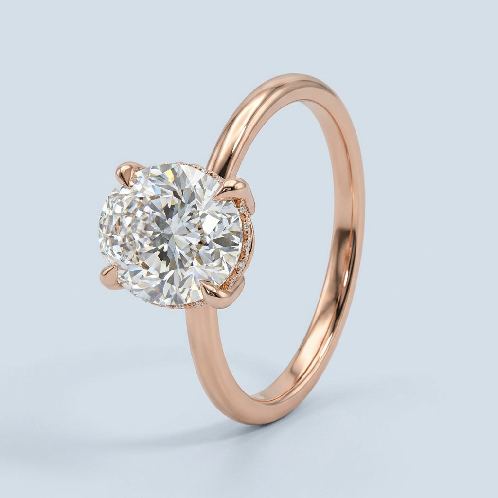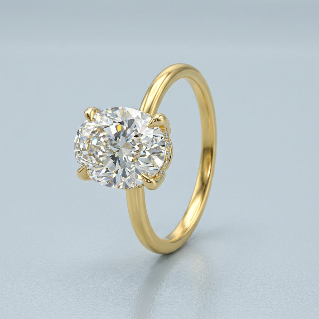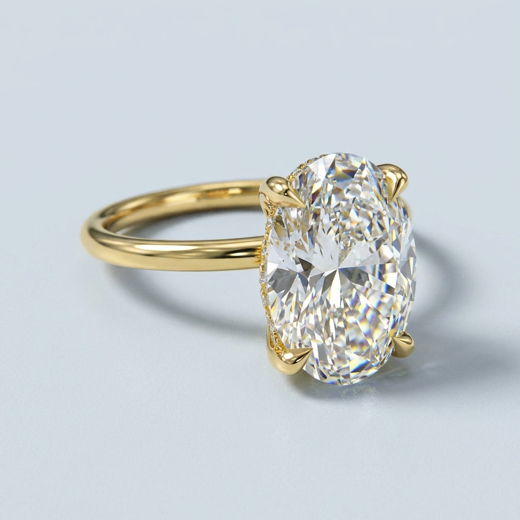 - The Hidden Halo: The defining feature is the petite basket halo (or 'Hidden Halo'), where Colourless accent lab-grown diamonds are French Pave set along the hidden gallery. This placement adds dramatic brilliance visible from the side profile without competing with the main stone.