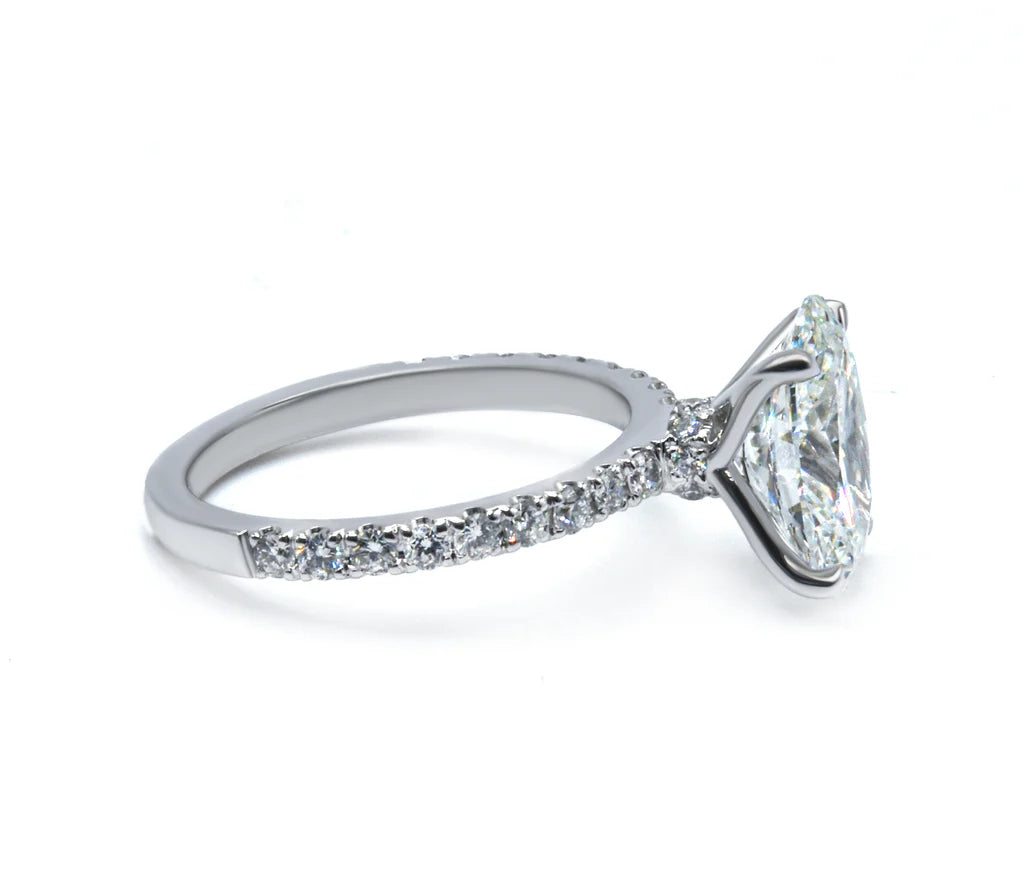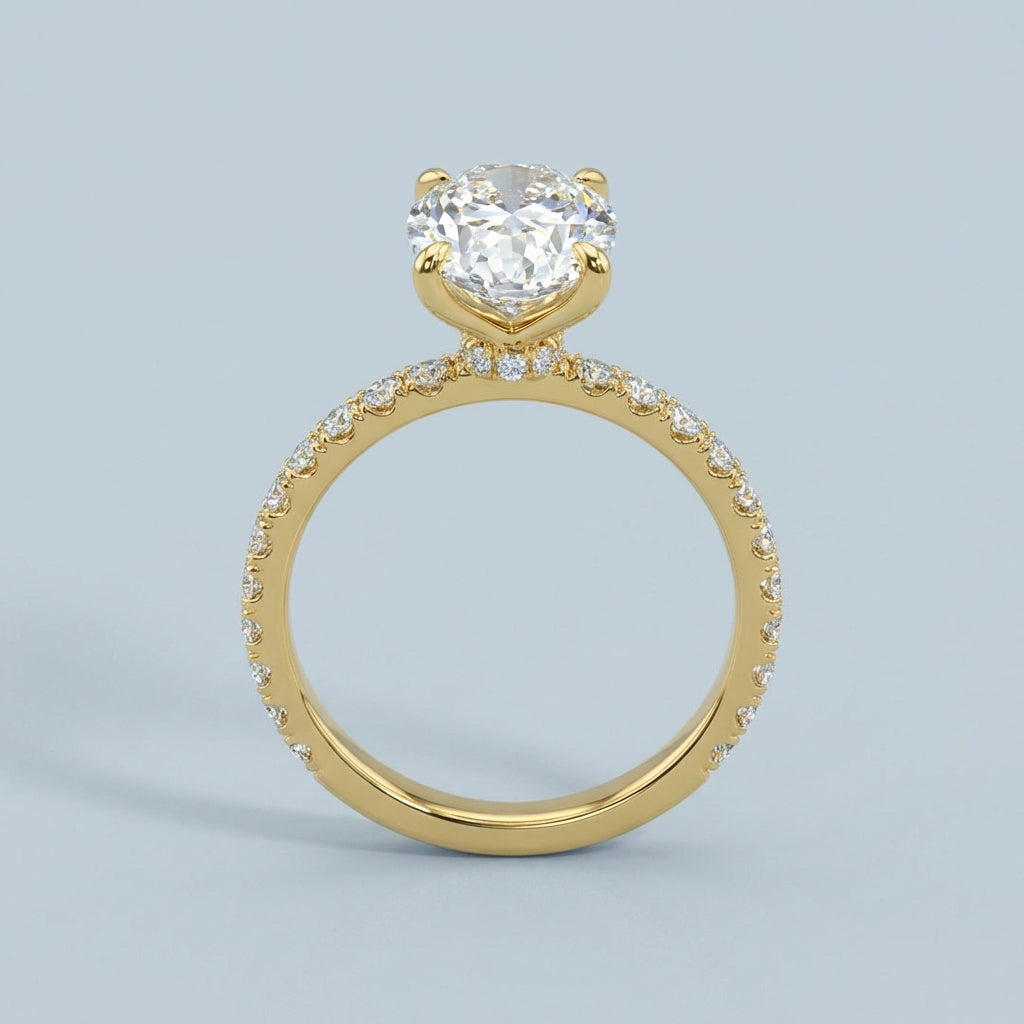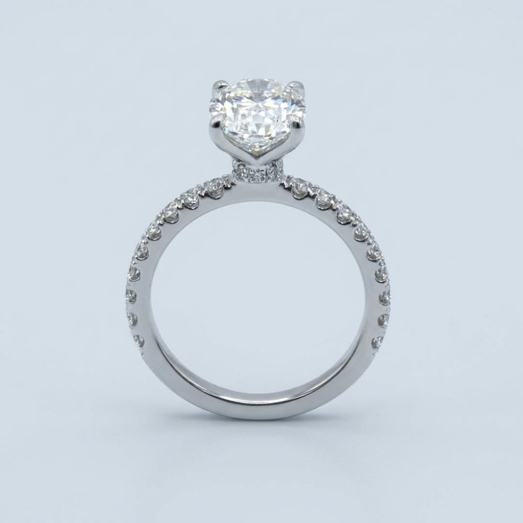 Exuding timeless sophistication, this exquisite ring showcases a brilliant oval-cut diamond as its focal point. Meticulously held in a secure four-prong setting, the center stone is positioned to capture and reflect light from every angle, maximizing its natural fire and brilliance. The design is further elevated by a delicate band adorned with a continuous row of shimmering pave-set diamonds, adding a seamless touch of luxury and glamour.