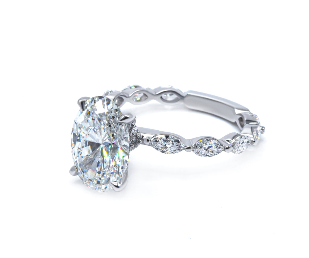 - Center Stone: Brilliant oval cut lab-grown diamond